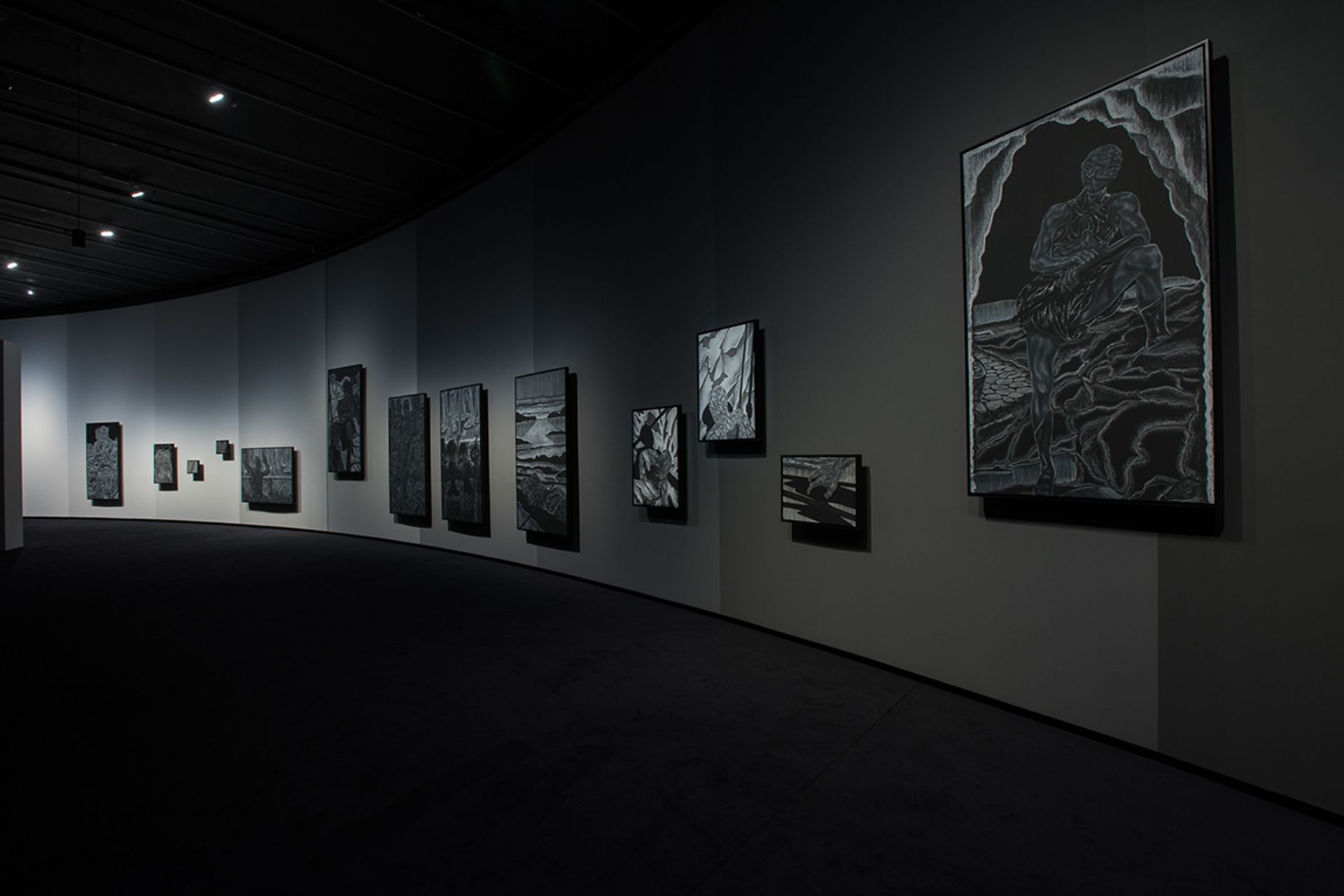 Adding to the multi-layered drama and overall cinematic feel of the installation is an atmospheric soundscape by Peter Adjaye. This responds to and complements the drawings, using a diverse range of sounds including wind, water, electronics and West African instruments. Often Adjaye’s elemental compositions find their counterpart in the landscape that functions as an active participant in Ojih Odutola’s drawings. The bodies of her protagonists are often both embedded within and emerging out of the richly textured geological forms that surround them. Especially seductive are the lush effects conjured out of the most minimal of palettes with Ojih Odutola taking an evident relish in showing the play of light across skin and musculature, as well as the rhythmic patterns of rock strata, soil and shadows.