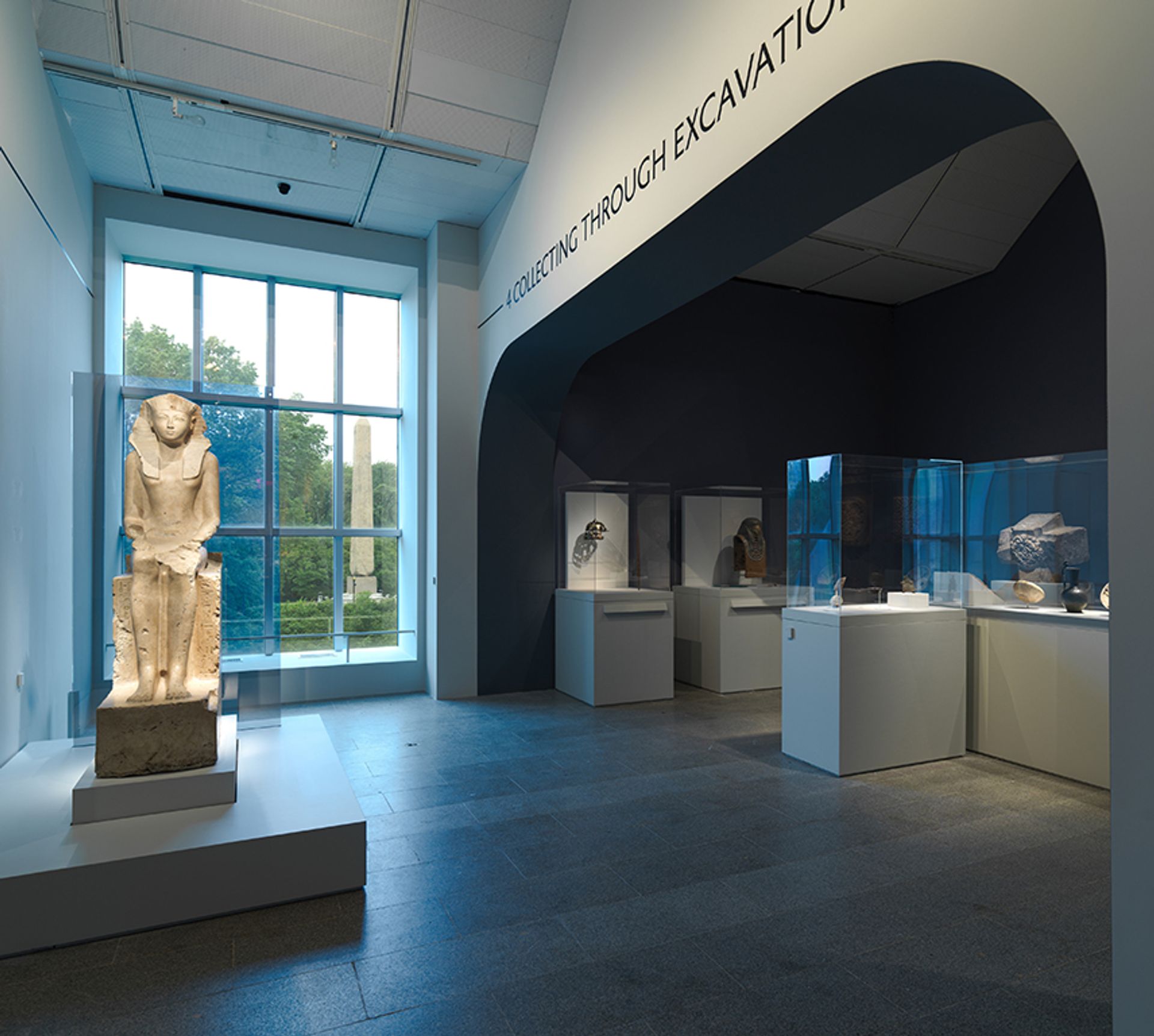 An installation view of Queen Hatshepsut (1479–1458BC) before a newly revealed window framing Cleopatra’s Needle in Central Park Courtesy of Metropolitan Museum of Art