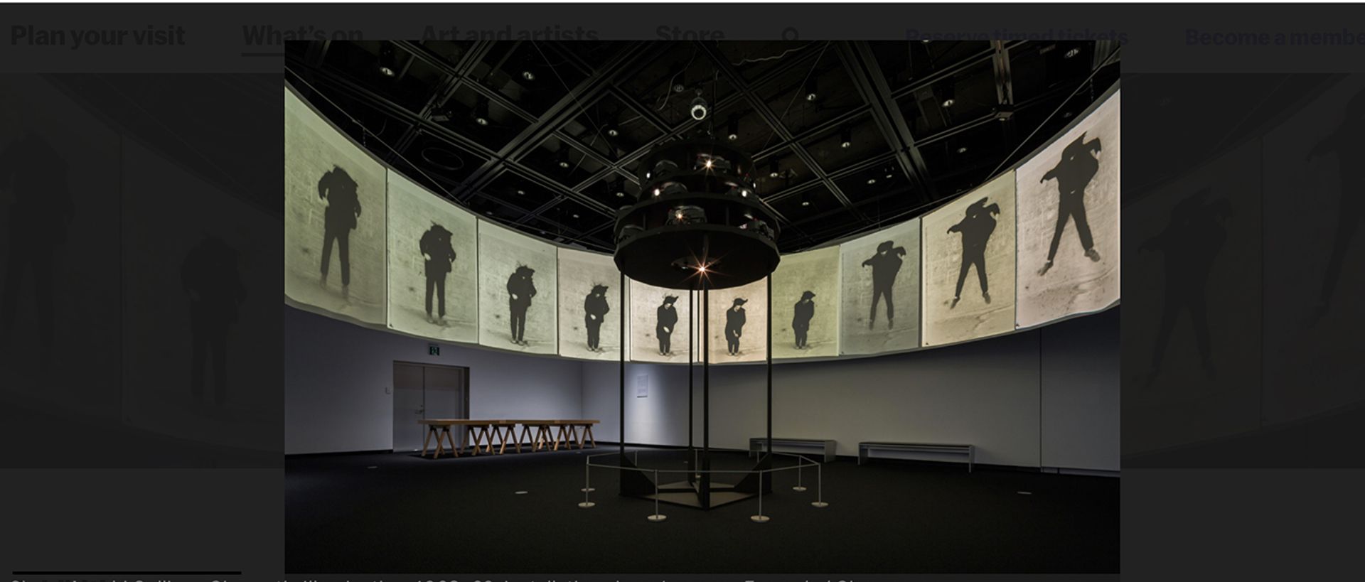 At this point, needing a rest, I headed to the darkened Kravis Studio, where the new installation of a vintage 1968-69 multimedia work by Shuzo Azuchi Gulliver offered seating, on a stool. I could have been a wallflower at a nightclub like Tokyo’s Killer Joe, the underground disco for which Gulliver made Cinematic Illumination. The action, set to an electronic soundtrack, was on a large zoetrope-like drum hanging overhead, the circular projection screen for 1,500 black-and-white images of everyday people in movies and magazines. Unlike the mirrored-ball effects playing up and down the walls, it didn’t spin, but it made me dizzy anyway.