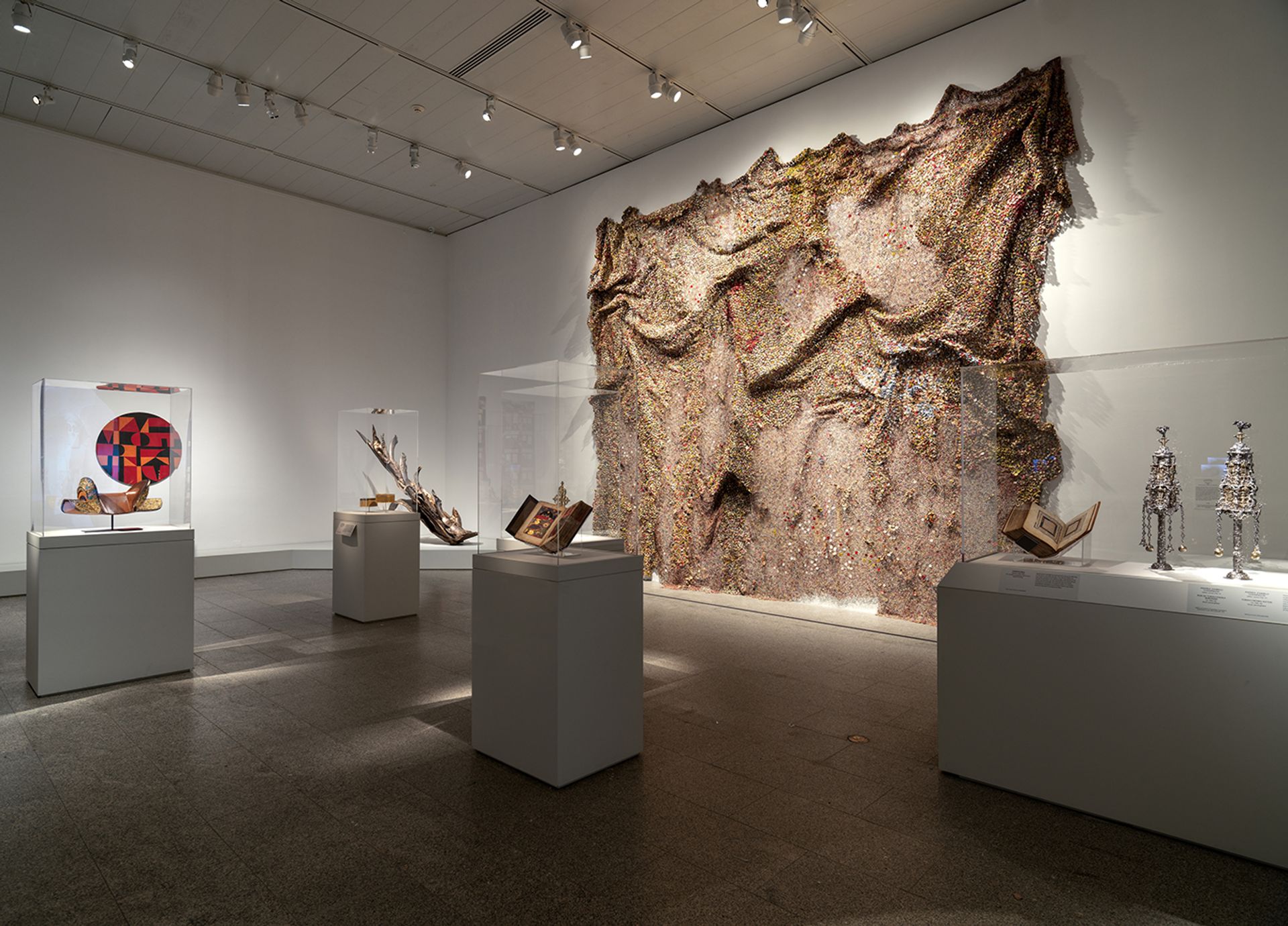 An installation view in Making the Met, 1870-2020, that includes El Anatsui's textile work Dusasa II (2007). Courtesy of Metropolitan Museum of Art
