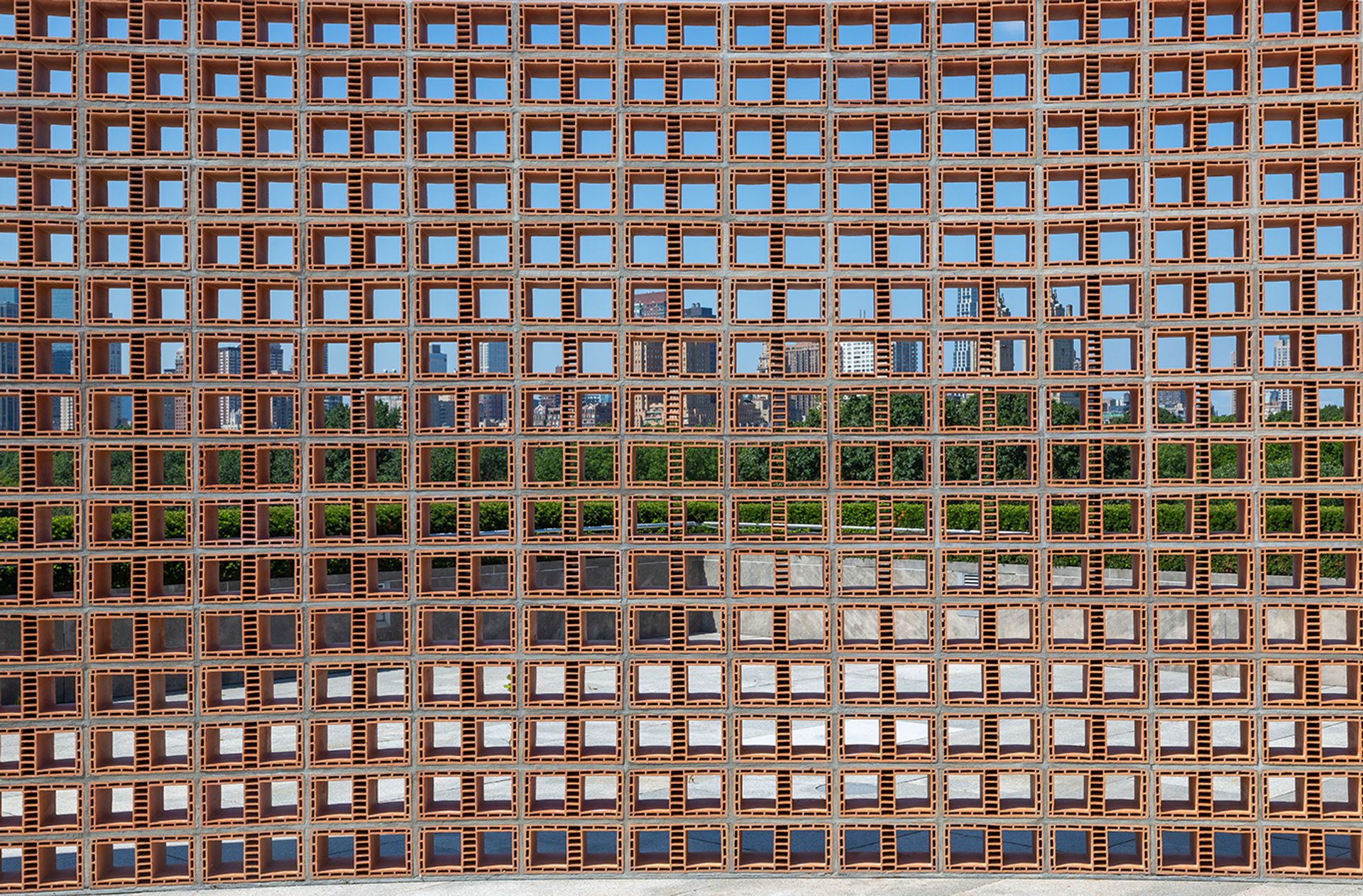Current politics inform this year’s rooftop commission by the provocative Mexican artist Héctor Zamora. His Lattice Detour is a gently curving brick sculpture that bisects the terrace, bringing to mind Richard Serra’s Tilted Arc, Maya Lin’s Vietnam War memorial and Donald Trump’s obsession with building an impregnable wall on the border between Zamora’s country and this one. The artist’s is real; it’s also an 11-foot high, 100-foot long illusion. At first sight, it appears solid and indifferent. Closer inspection reveals an open grille of hollow clay blocks. Though it is impassable and obscures the the city views, you can see through to the other side, then walk around to look back where you started. Perspectives alter. The border stays put.