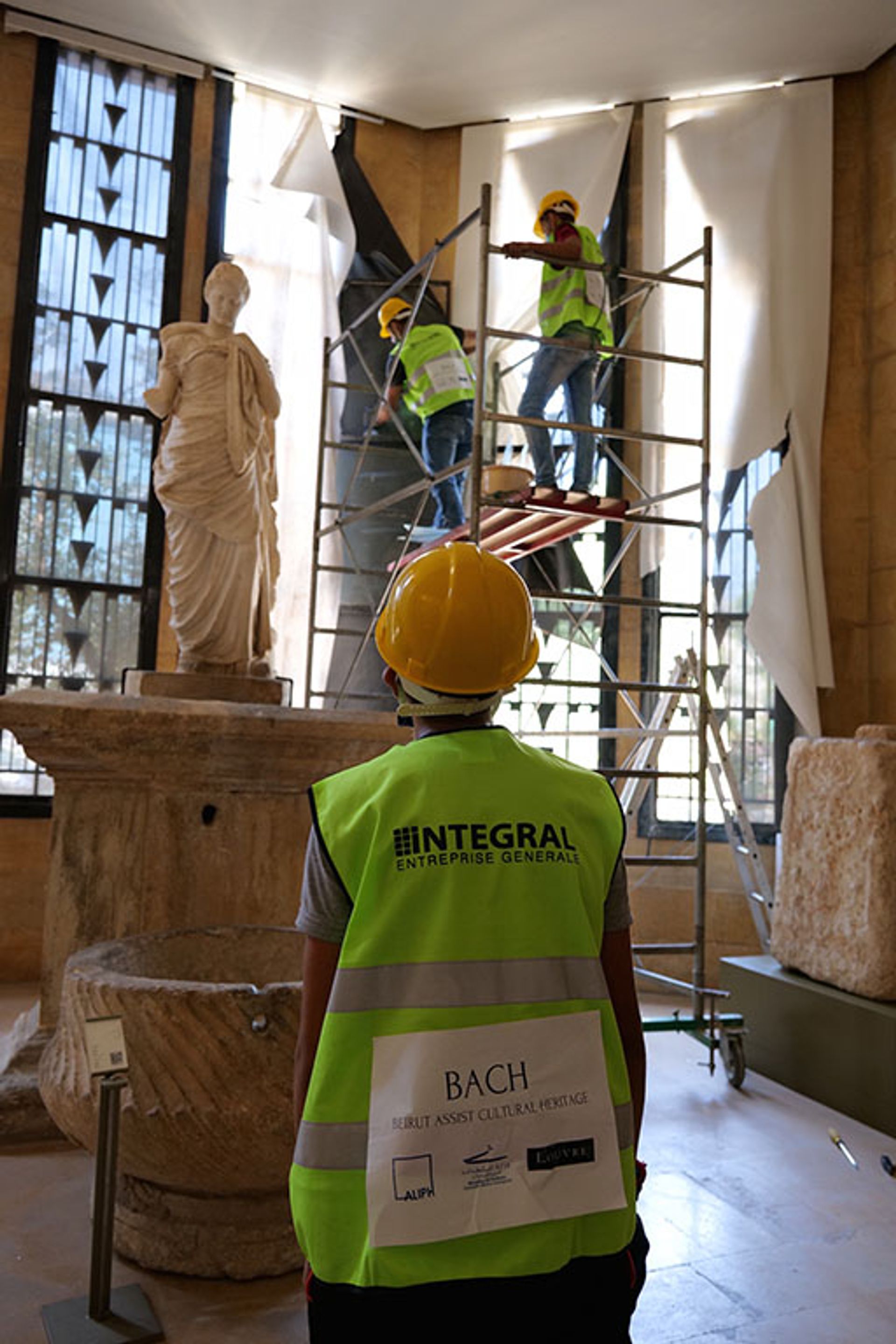 Workers attending to the lofty windows at the National Museum of Beirut Julien Chanteau