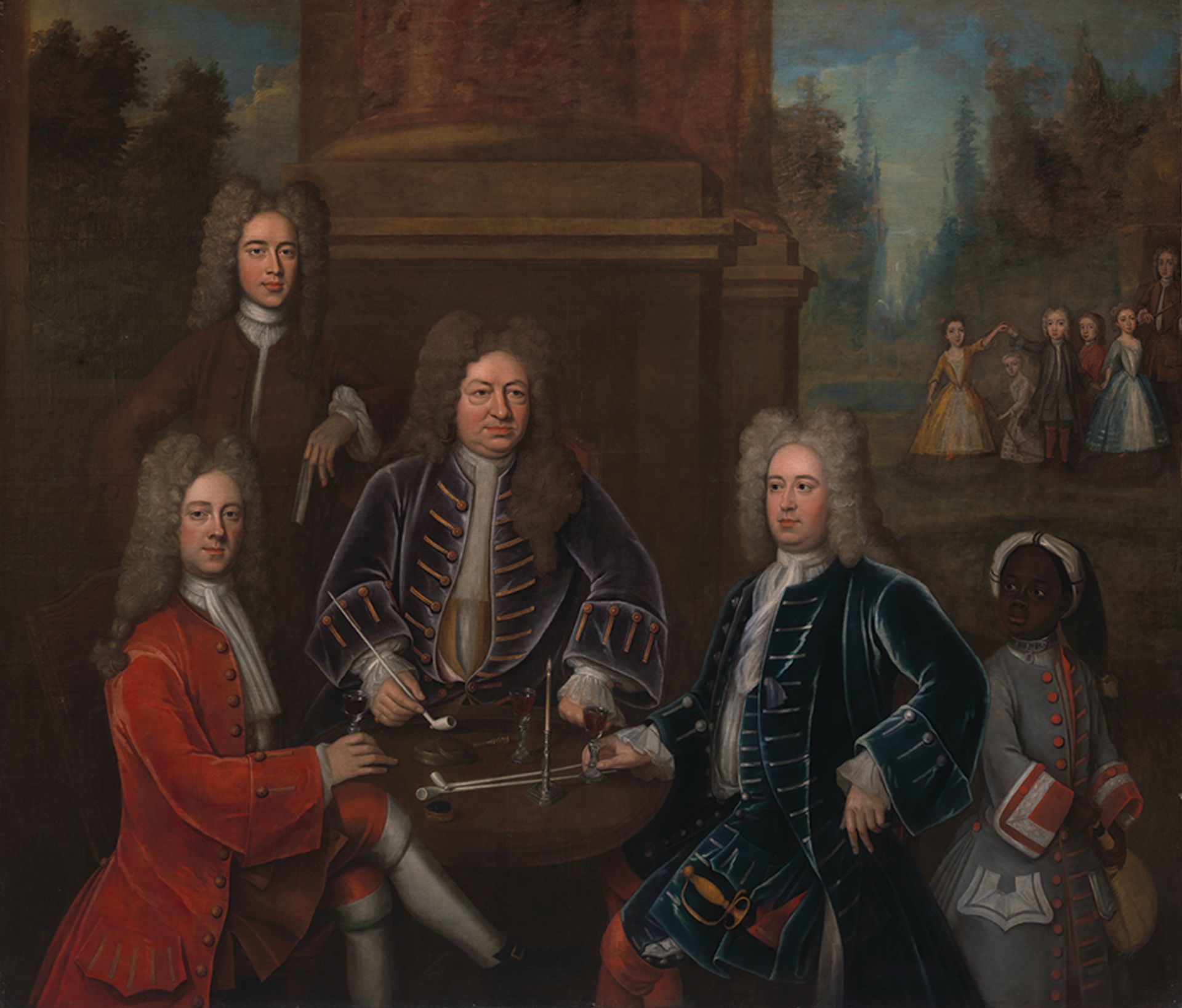 1708 painting by an unknown artist depicting Elihu Yale, one of Yale's founders, within a group portrait that also features an enslaved child Yale Center for British Art, Gift of Andrew Cavendish, 11th Duke of Devonshire