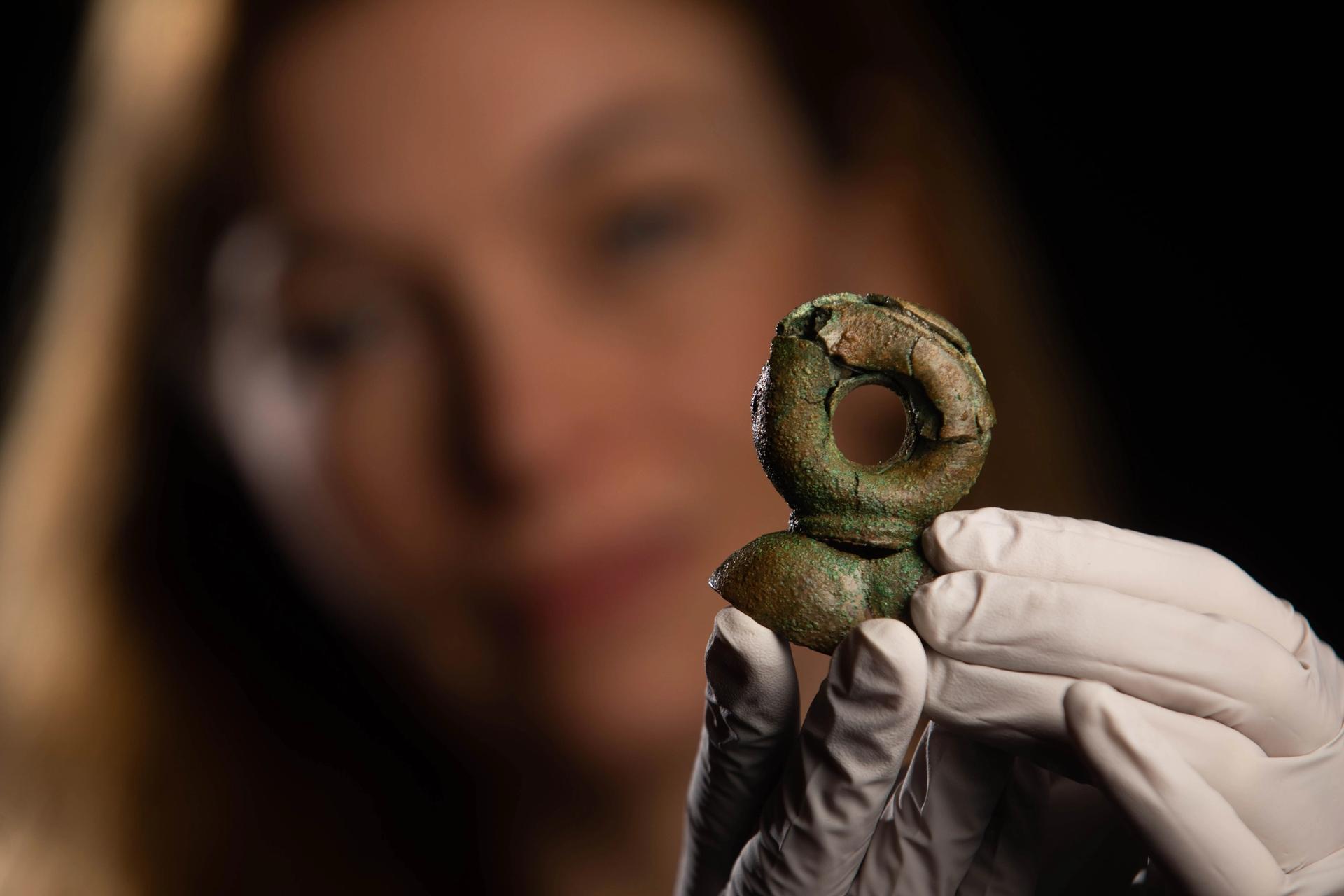 Curator Kate Sumnall reveals a rare Terret Ring from Havering Hoard: A Bronze Age Mystery © David Parry/PA Wire