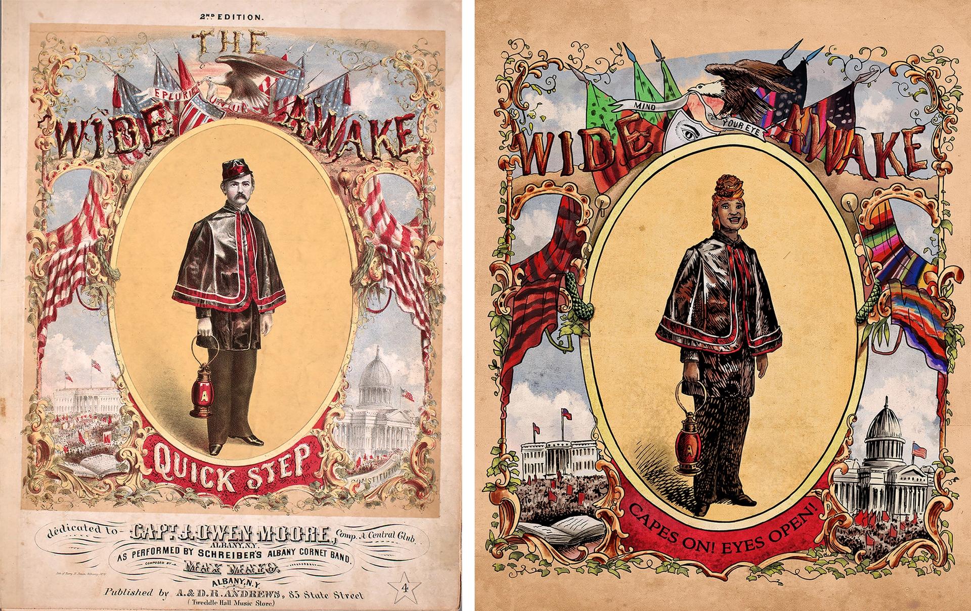 The original Wide Awakes wore oilcloth capes, which have inspired the artist-designed capes emblazoned with eyes Thomas's Wide Awakes group has created. Burton Historical Collection, Detroit Public Library