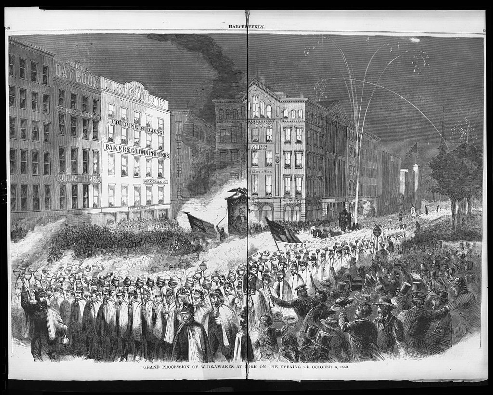 An illustration from an 1860 edition of Harper's Weekly depicting the original Grand Procession of Wide Awakes in New York. Library of Congress Prints and Photographs Division