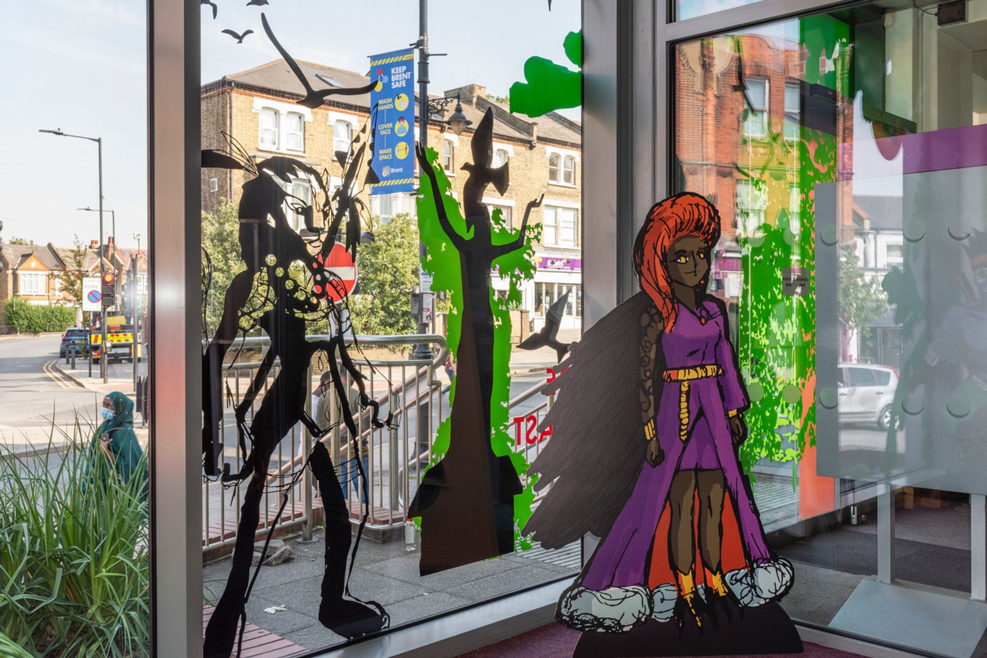 The British artist David Blandy has worked with young local people to imagine what Harlesden will look like 8,000 years from now. This takes the form of a lush, flooded, forested terrain abandoned by humans who have lived underground for millennia, with new life forms emerging on the surface. Large-scale images of this post-human world and its population of hybrid humanoids rendered in bold vinyl cut-outs fill the library and run across its façade; while a timeline stretching up the library stairs traces the history of the area, from a small Saxon settlement through to a Tudor village and into its imagined future, set in a high fantasy world of The World After in the year 10,000. Here, the shore of the inland sea near Harlesden runs along the edges of what was Kensal Green and Acton.