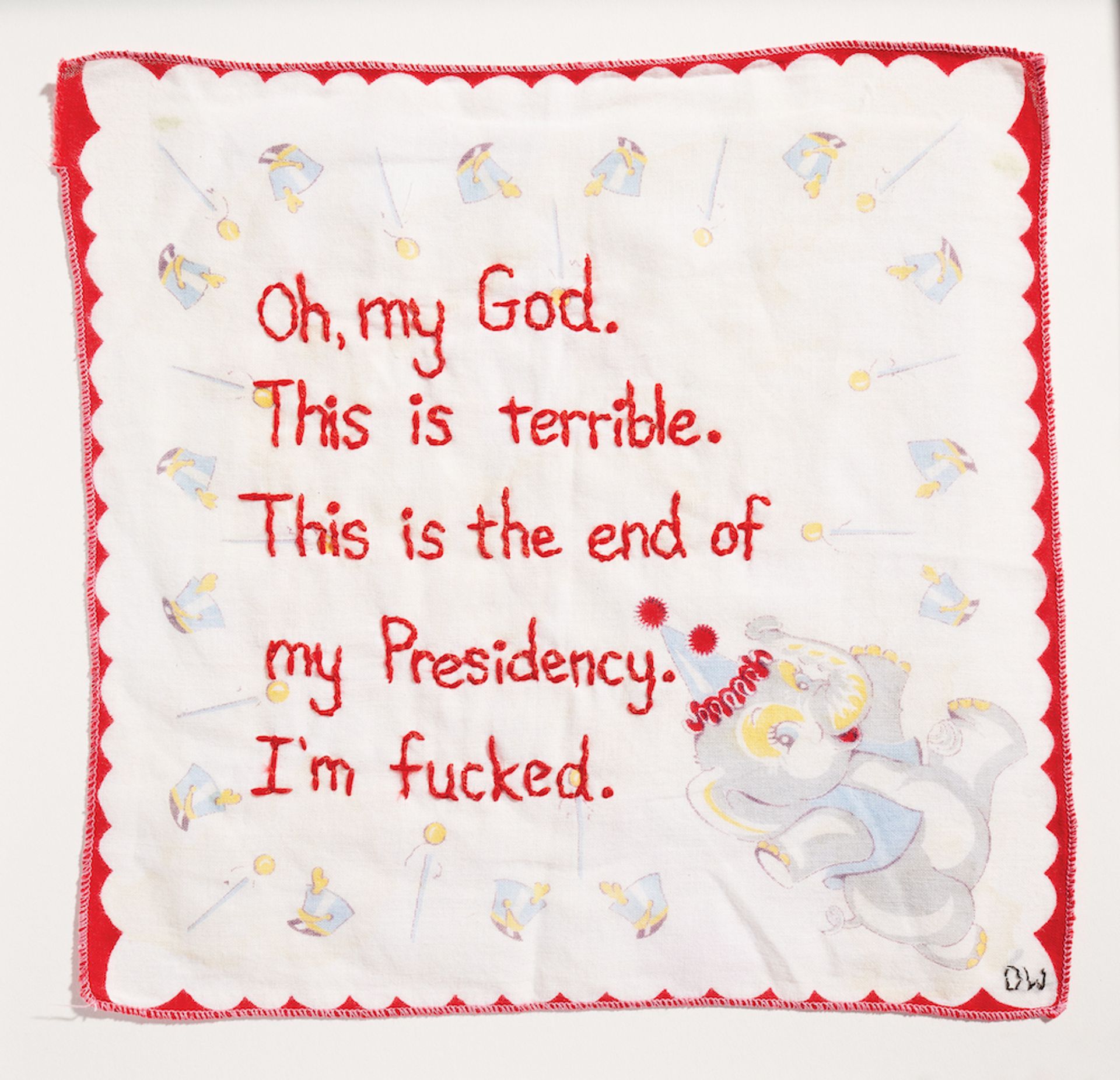 “My two greatest assets have been mental stability and being, like, really smart,” Trump tweeted in January 2018 in response to the release of Fire and Fury: Inside the Trump White House, the journalist Michael Wolff’s book criticising his administration. Trump concluded by describing himself as “a very stable genius”—a statement Weymar felt compelled to satirically stitch onto one of her grandmother’s floral needlework projects. When she posted a photo of her completed piece to Instagram, the positive response encouraged her to embroider more of Trump’s statements. Once she started making them, she could not stop.