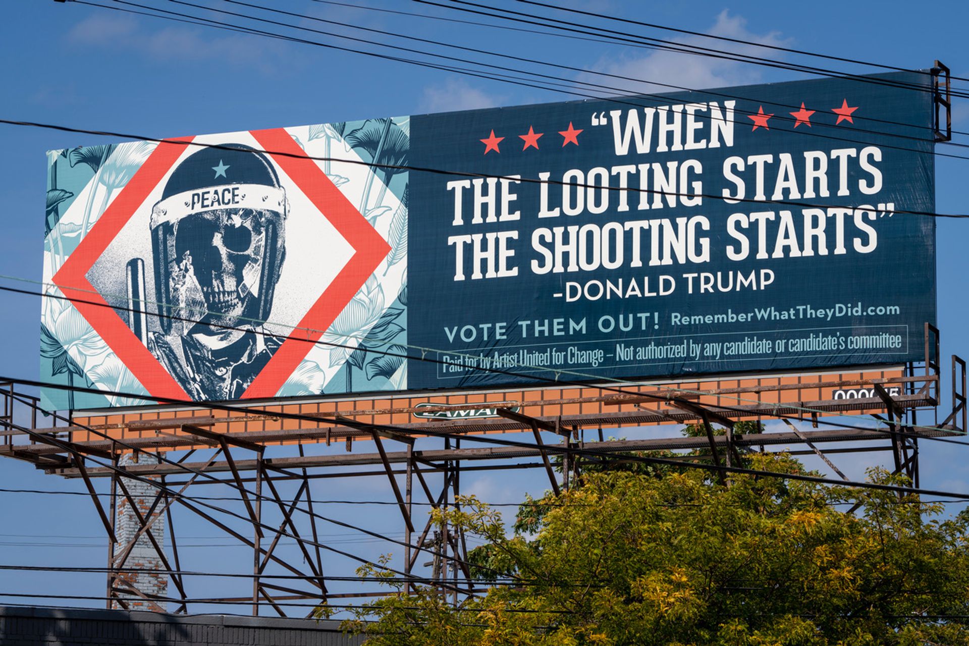 Shepard Fairey, the noted street artist, used Trump's controversial quote "When the looting starts, the shooting starts" about the Black Lives Matter protests for his billboard Photo: Bob Glick, courtesy of Artists United for Change