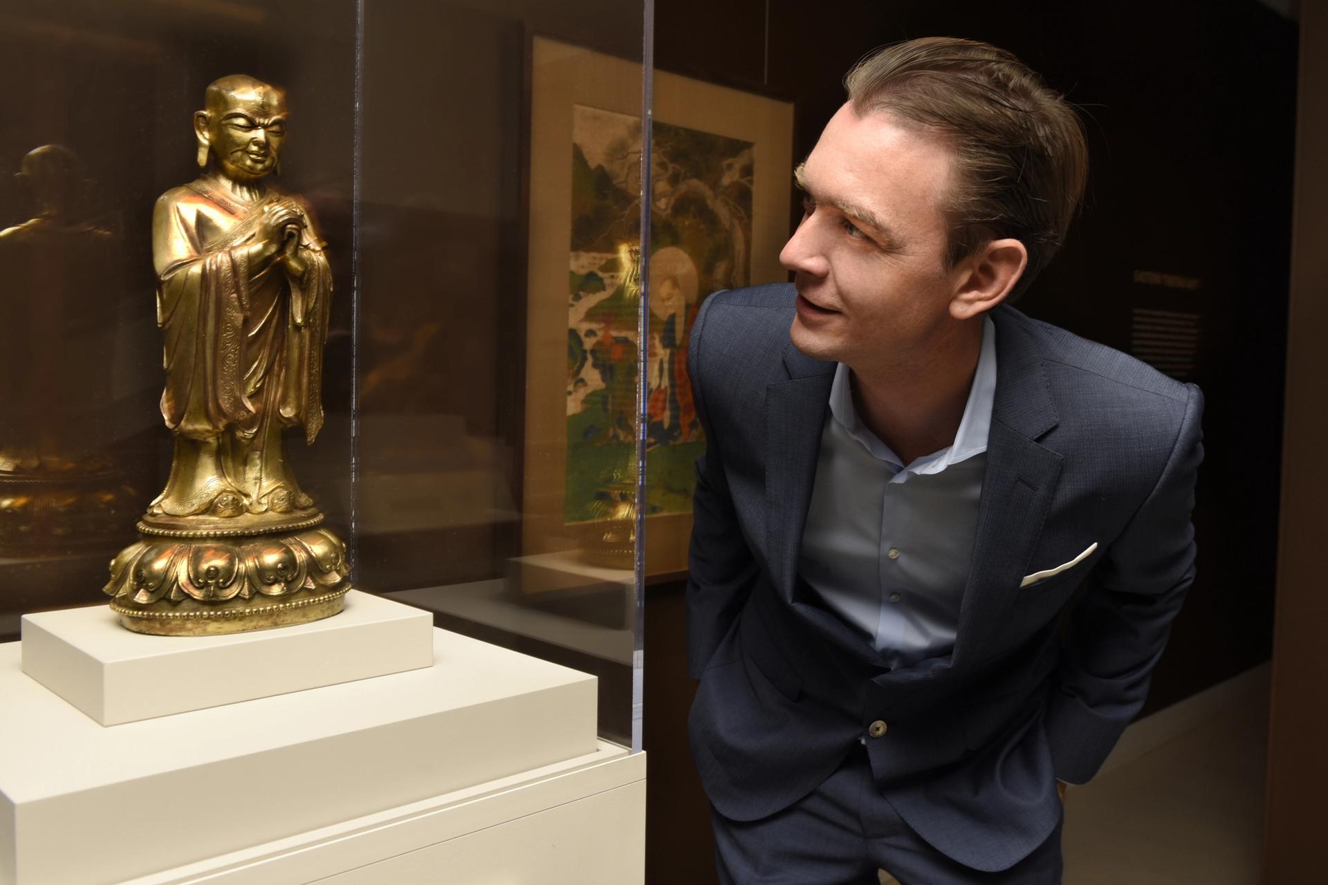 Jorrit Britschgi, executive director of the Rubin Museum of Art, with a Ming Dynasty statue of an arhat