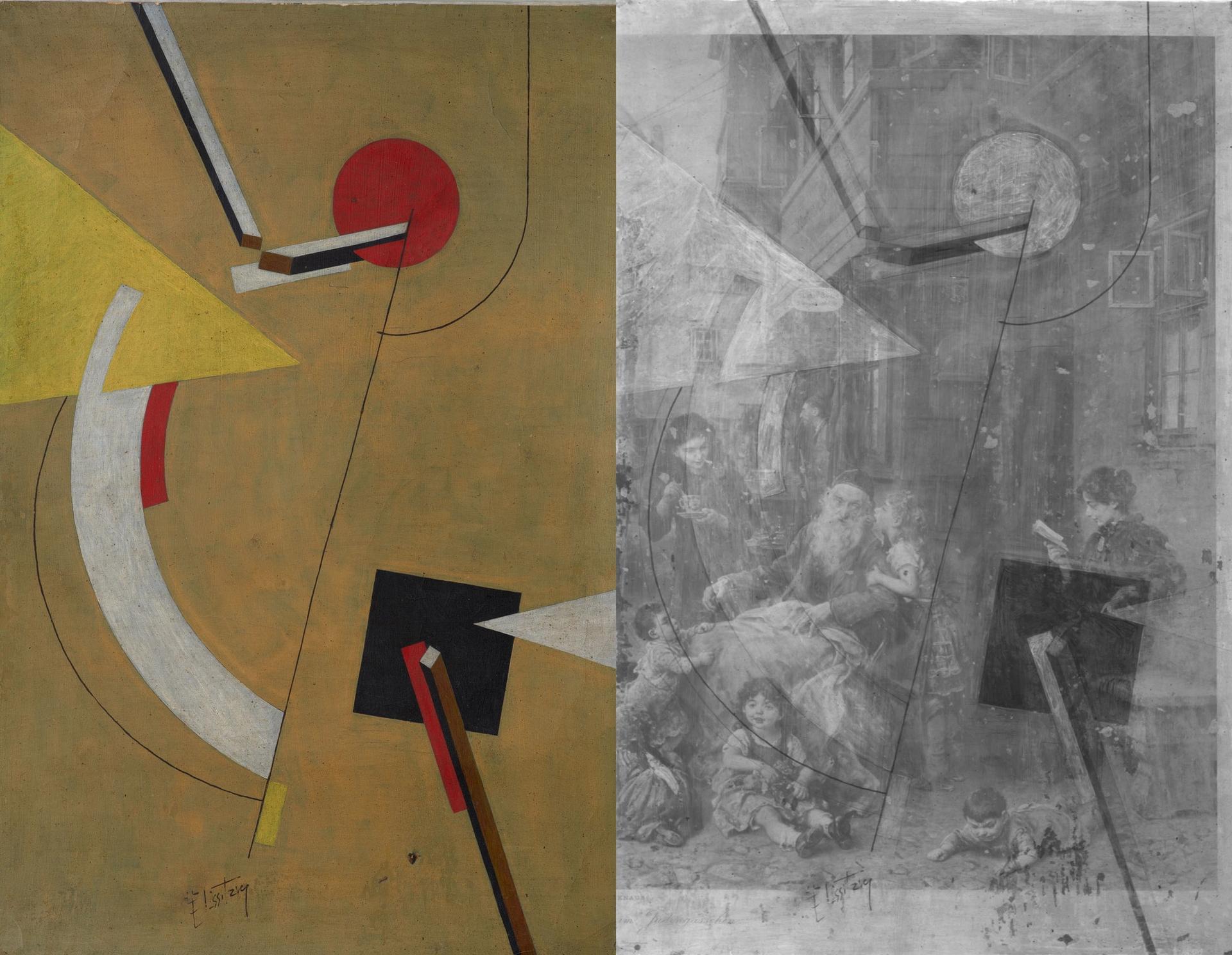 Infrared analysis cast doubt on the authenticity of Proun, a painting previously attributed to El Lissitzky and dated to 1923 Left: Rheinisches Bildarchiv Köln. Right: Museum Ludwig Köln / Restaurierungszentrum Düsseldorf / Ulrik Runeberg / Inken Holubec