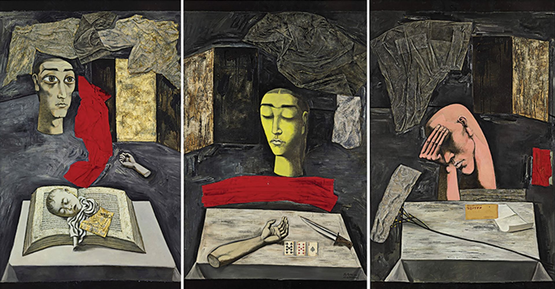 Zhang Xiaogang’s The Dark Trilogy: Fear, Meditation, Sorrow (1989-90) will be auctioned at Sotheby’s Hong Kong on 6 October (est $3.2m-$5.8m) Courtesy of Sotheby’s