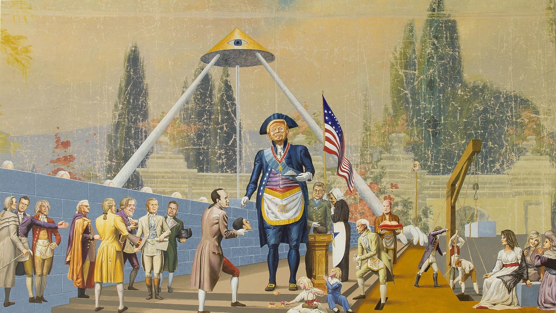 The other Trump painting, The Master Mason (2020), is based on a US painting, or mural, of George Washington setting a cornerstone in a Masonic ritual. “Trump is surrounded by enabling sycophants who mostly share his xenophobic wall building mania,” Shaw says.