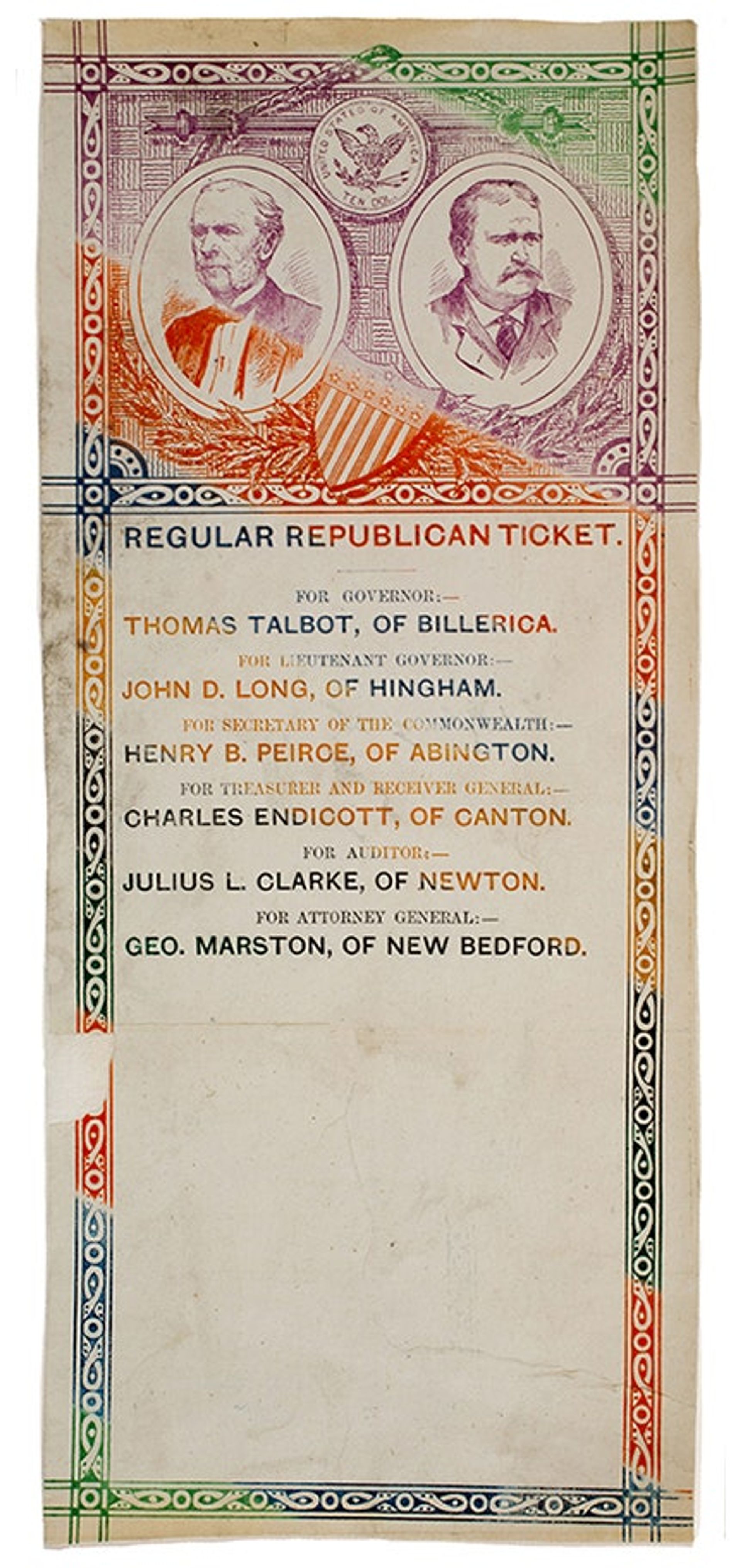 This Republican ballot from 1878 shows the “split fountain” printing technique, which involved the application of multiple coloured inks onto a roller. Courtesy of the Cooper Union