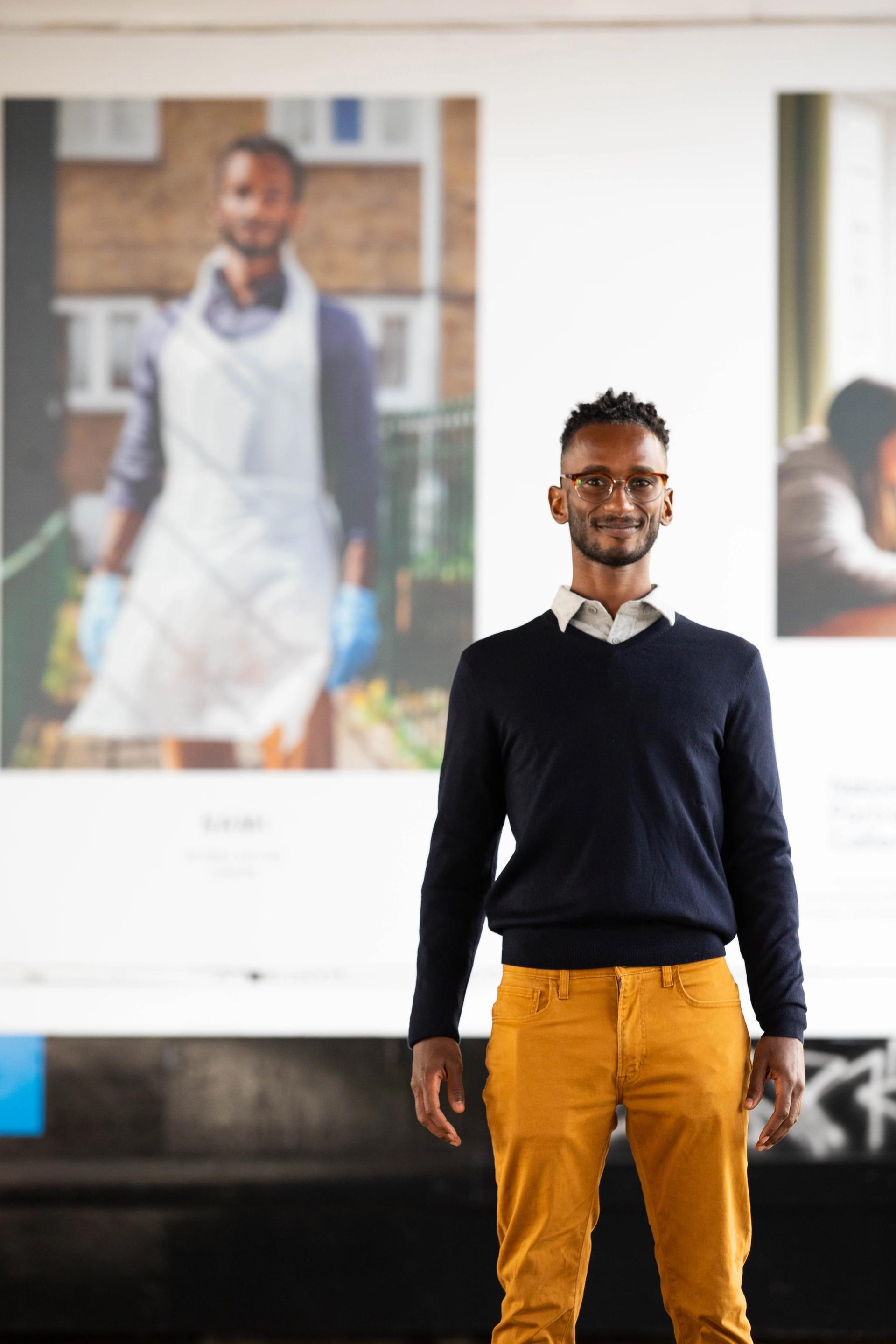 Sami Massalami Ayad in front of his Hold Still portrait Sami (2020) by Grey Hutton Photo: David Parry