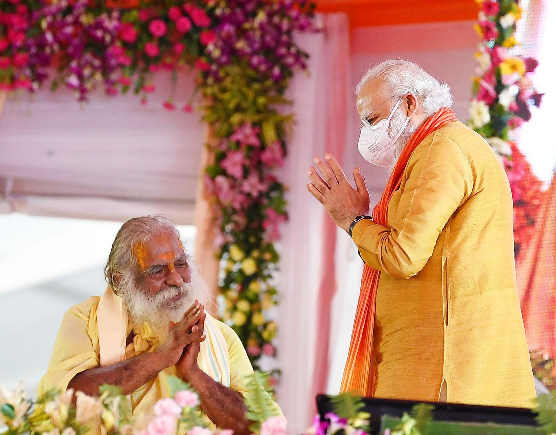 Indian prime minister Narendra Modi with Mahant Nrityagopal Das at the foundation stone laying ceremony of Shree Ram Janmabhoomi Mandir, in Ayodhya, Uttar Pradesh on August 05, 2020
