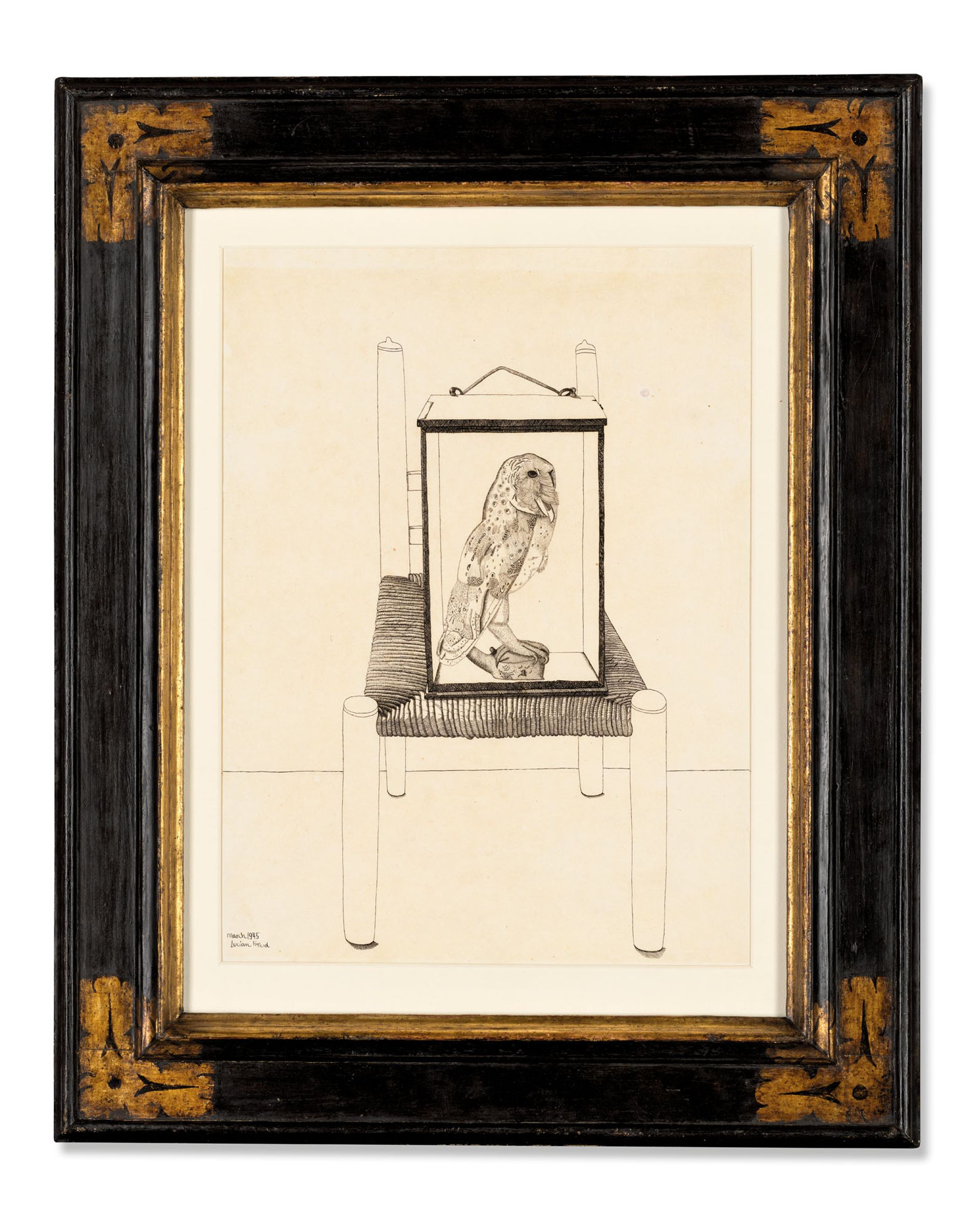 A beautiful early ink drawing of a taxidermy owl in a case by Lucian Freud, Untitled (Interior Drawing, The Owl, 1945), will be familiar to anyone who saw the now-shuttered Blain Southern show of early drawings by Freud in 2012. That show took place in what is now the art and antiques dealer Danny Katz’s gallery on Hill Street in Mayfair and it was Katz who was selling the work at Christie’s tonight—he had bought it in 2011 at Sothebys for £517,250 (with fees). It sold on the lower end of a £800,000 to £1.2m estimate (or £982,500 with fees), thanks to entirely London-based phone bidding.