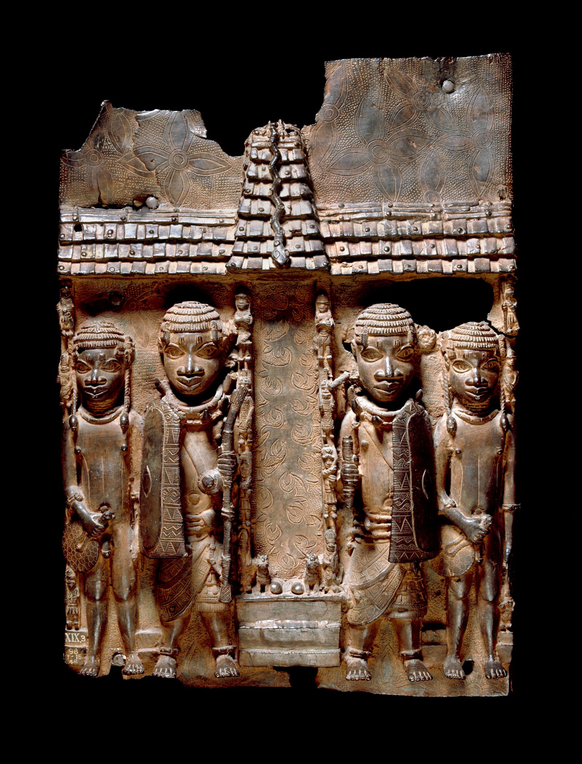 This Benin plaque (16th-17th century) showing Benin court officials flanking a palace entrance or altar in part of the British Museum's collection 2020 © Trustees of the British Museum