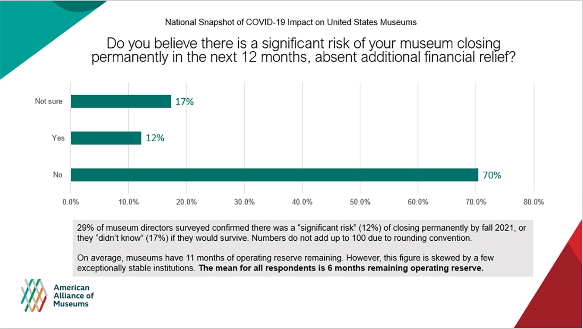 A total of 29% of museum directors surveyed said that there was either a "significant risk" of closing permanently or they "didn't know" whether they would survive. American Alliance of Museums
