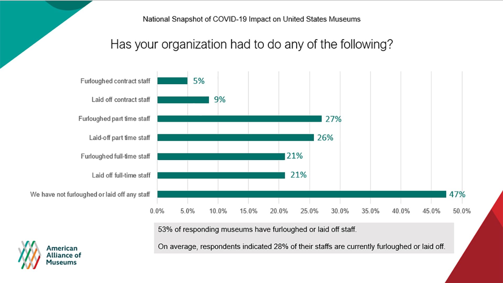 On average, US museums reported in a survey that 28% of their staffs are currently furloughed or laid off American Alliance of Museums