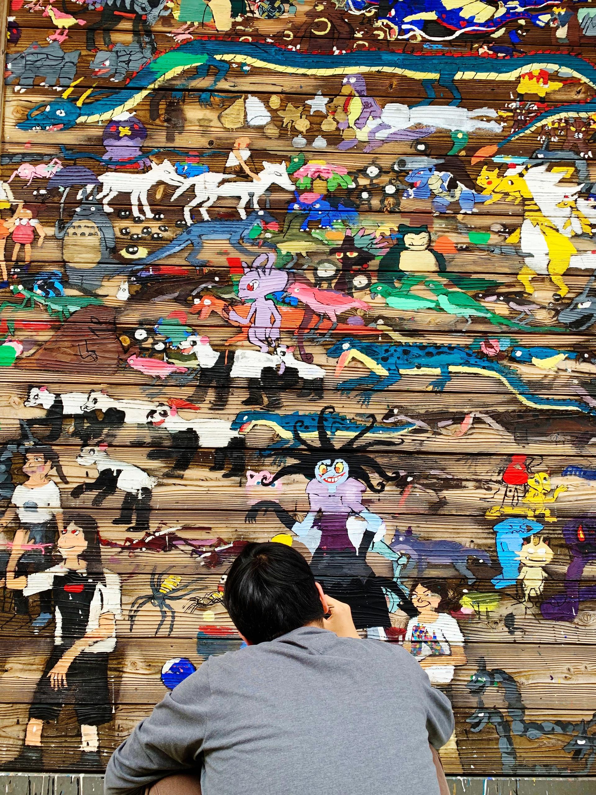 The artist creates these multipaneled series at the Atelier Yamanami in Shiga prefecture, where he has worked since graduating from high school in 2014. The arts-focused welfare facility welcomes members of all ages with developmental, intellectual, and physical disabilities, and Ukai is on the autism spectrum. “The atelier’s policy is to welcome everyone who wants to come,” Rousseau explains. “The only set schedule is lunchtime.” Members do a few things in common, but are mostly free to spend their days pursuing creative interests. When he is not drawing, Ukai also works on a clay series of miniature skeletons and dinosaurs. He has also recently started to paint the outside wall of a house at the atelier.
