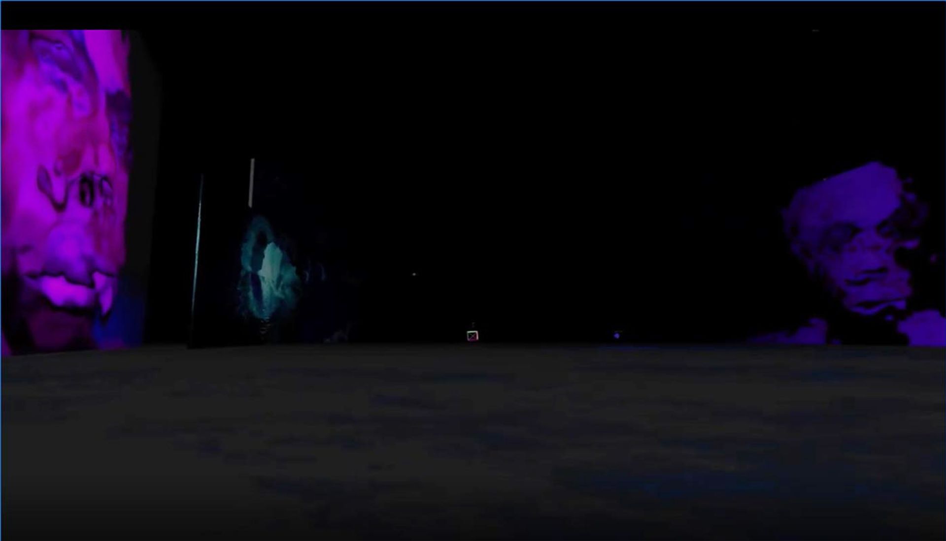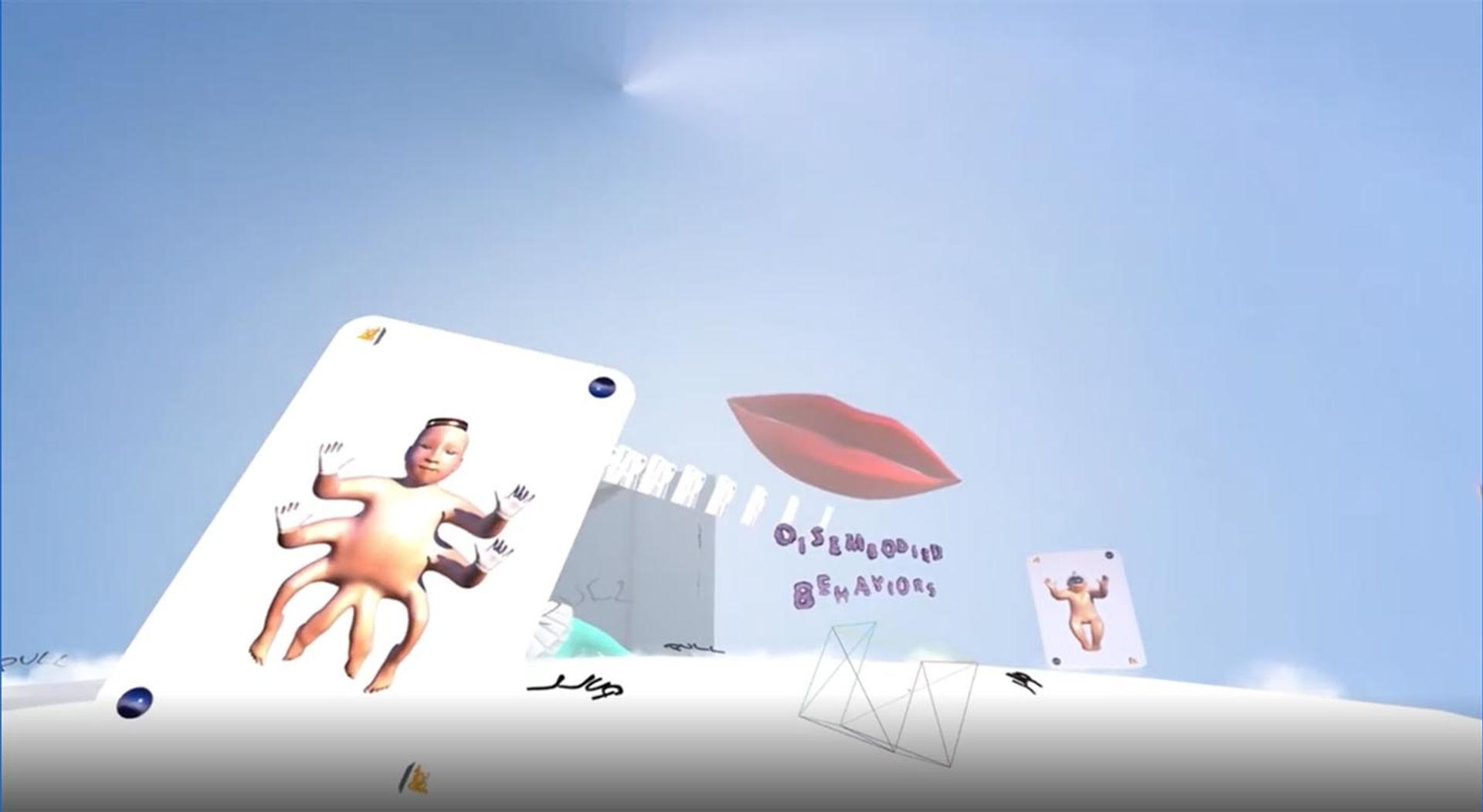 Loading Disembodied Behaviors, I see asset names shuffle left to right and then my stomach falls as I pause, lurch down into a metallic blob. Standing in the shadow-shimmer cavern, a 2D magenta triangle with the name qv9q27zg54—an avatar of another user in this underworld—punctures the simulated 3D of the screen but refuses to talk to me.