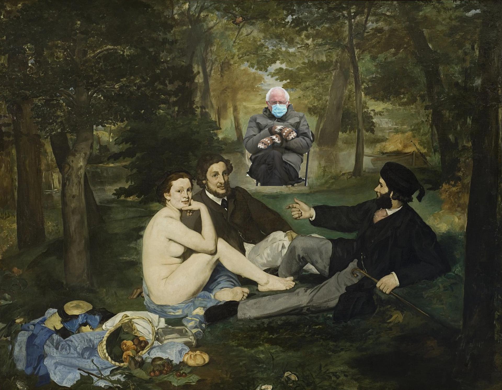 The voyeur from Vermont? We doubt Bernie's kinks extend to more than harmless Leninist roleplay, but these frolicking Parisians appear to have made him witness to quite the salacious scene. Though if anyone's the pervert here we suspect it's the fully dressed men having breakfast with a naked woman.