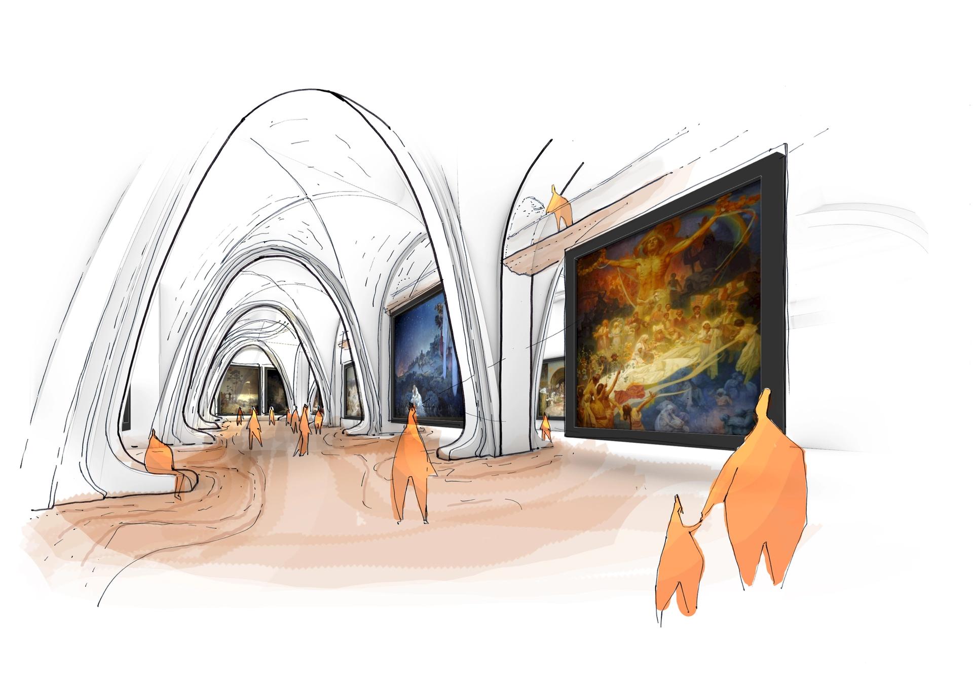Heatherwick Studio's first sketches for how the Slav Epic might be displayed in the new space to be built in Prague © Heatherwick Studio. Courtesy of the Mucha Foundation