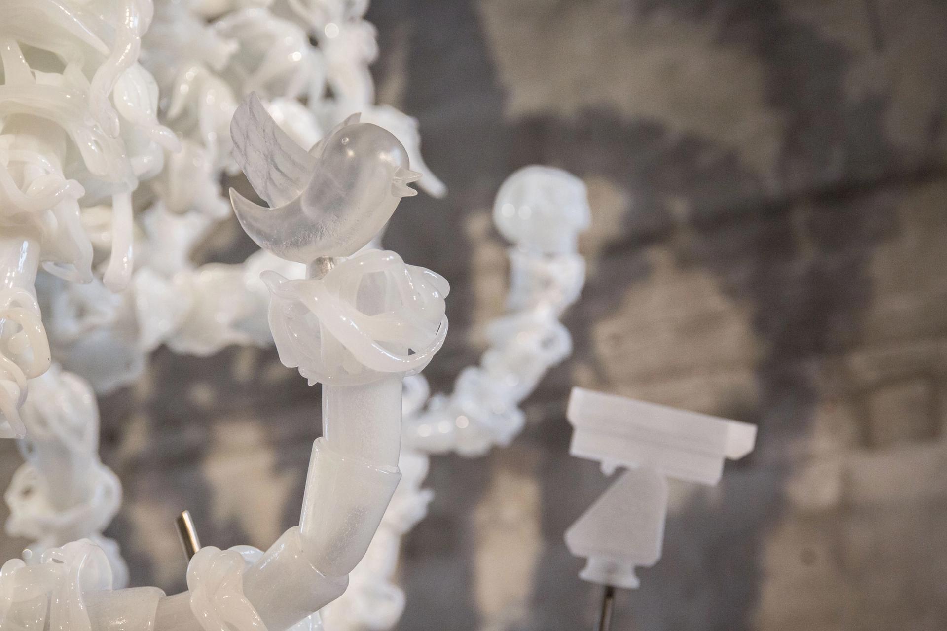 Weiwei’s oversized Blossom Chandelier, for example, looks ornately floral from a distance, but on closer inspection is made up of Twitter birds fluttering near hands flipping the bird, as well as security cameras and skulls. Dike Blair reproduced a Windex bottle in glass, and Vik Muniz created Individuals, human-scale reproductions of lavish wine goblets. “Glass is so flexible, glass can become almost anything you want. It belongs already to the creative realm,” Muniz says in a short documentary prepared for the exhibition.