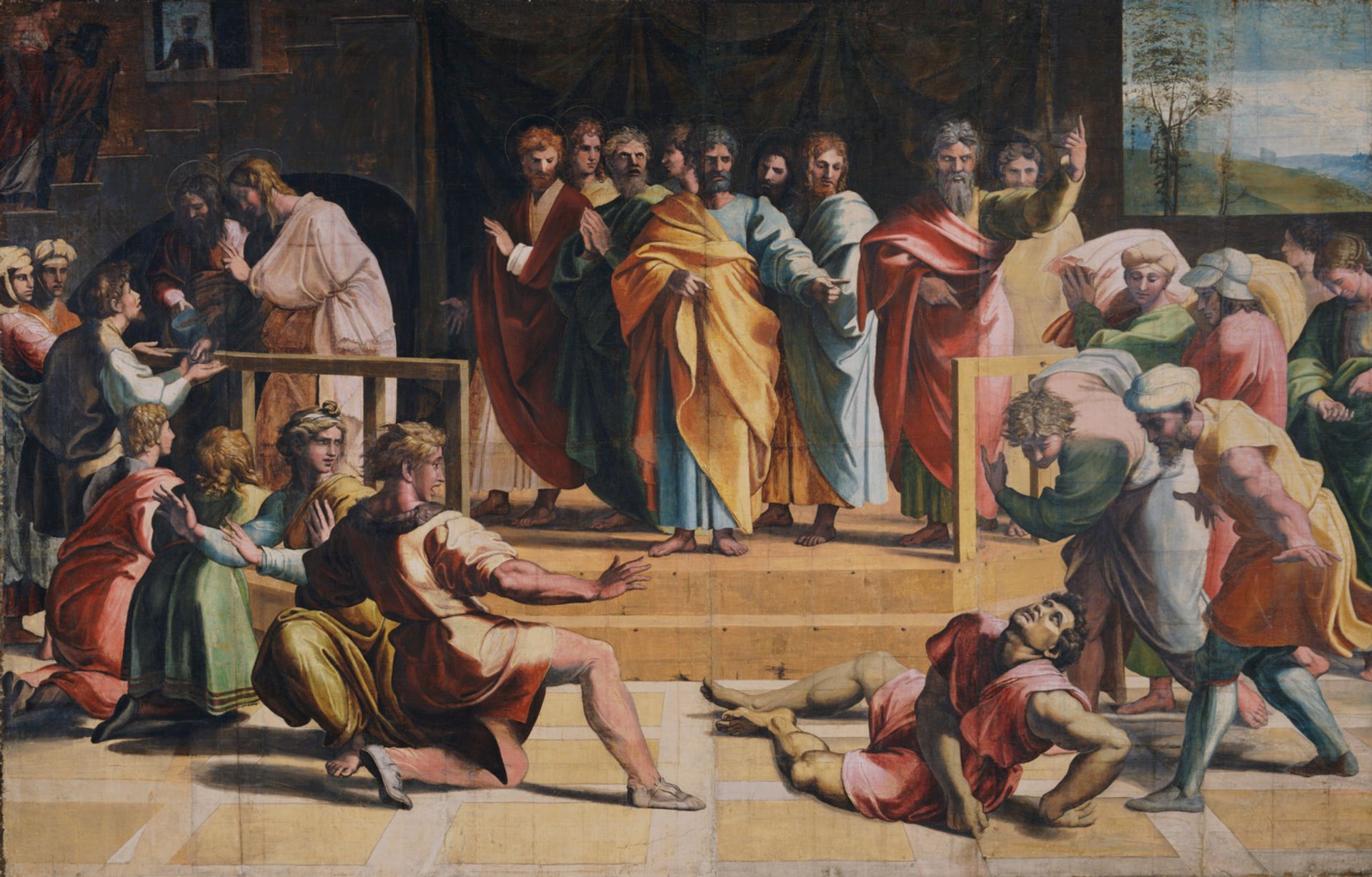 The Death of Ananias, one of Raphael's seven surviving full-scale painted designs on paper for the Acts of the Apostles tapestry series, depicting the lives of saints Peter and Paul Photo: © V&A; courtesy Royal Collection Trust Her Majesty Queen Elizabeth II 2020