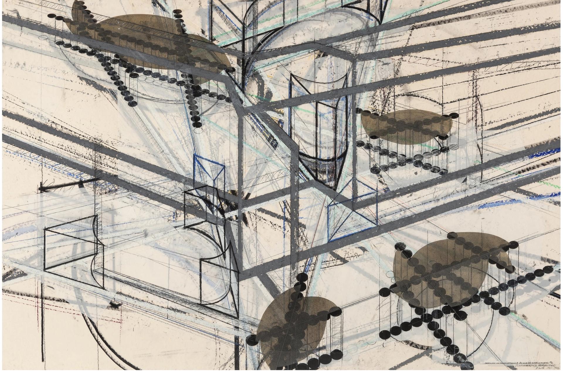 Barry Le Va, Drawing Interruptions: Blocked Structures #6 (Combined in 2 Perspectives), 1981-82, ink, pencil, charcoal, paint stick with tracing paper collage on paper