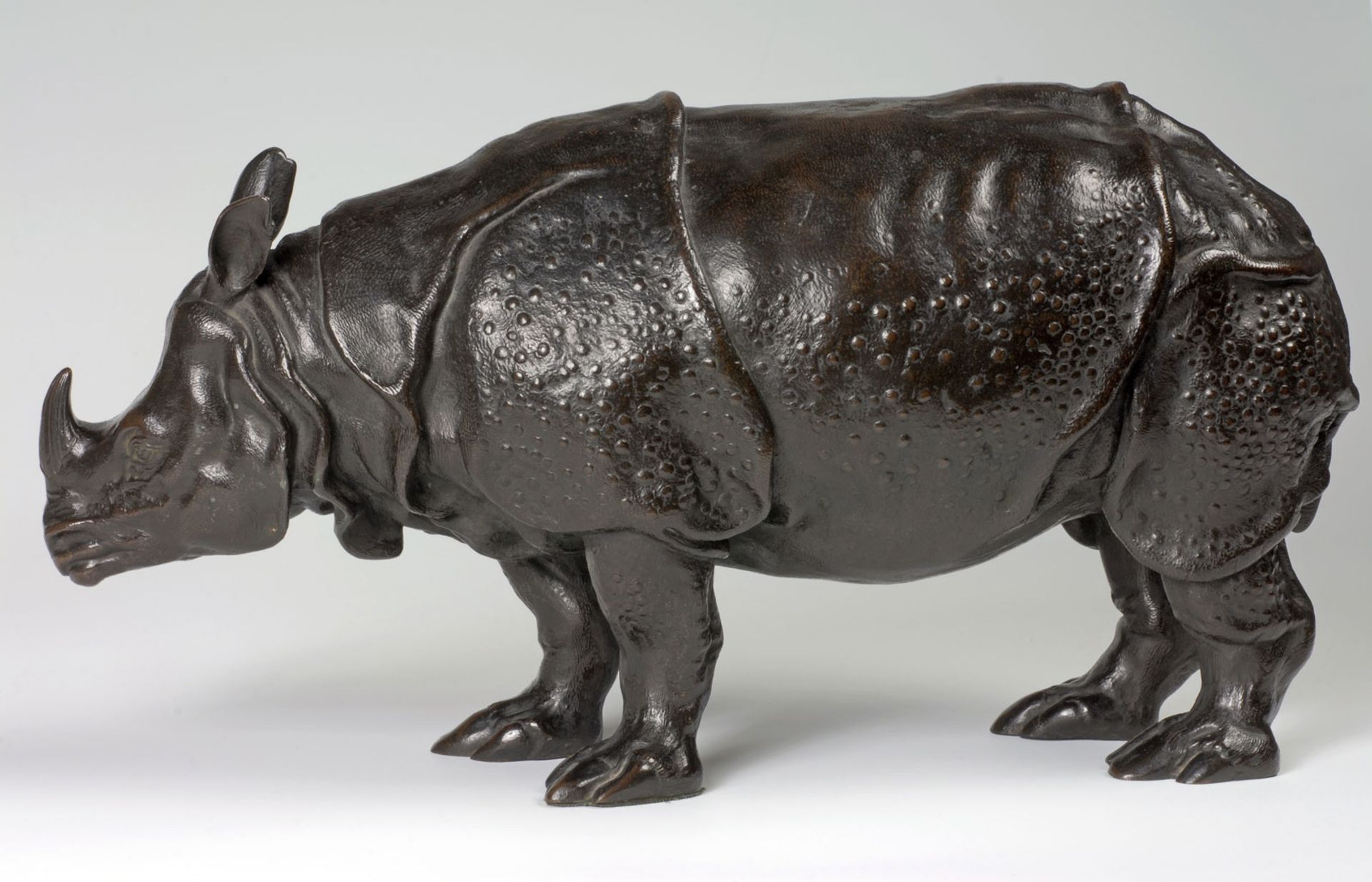 Miss Clara was a great Indian beauty who arrived in Rotterdam in 1741 and toured Europe, feted by kings, queens, and commoners alike—she even had a French Navy ship named after her. She also had a thick skin, useful to those thrust into the public eye, because she was a rhinoceros. A small exhibition at Birmingham’s Barber Institute of Fine Arts will use the museum’s bronze sculpture A Rhinoceros, called Miss Clara (1738-58), attributed to Peter Anton Verschaffel, to look at rhinos, elephants and hippopotamuses who gained notoriety in Europe between the 16th and 18th centuries. Among the pachyderms on show will be a sculpture of the hippopotamus Obaysch, made from Nile mud shortly after the animal was shipped to London in 1849 as a gift to Queen Victoria, and elephants including Hansken, who was sketched by Rembrandt, and Hanno who was a gift from King Manuel I of Portugal to Pope Leo X. Manuel I had form on large exotic animals, having also been the recipient from India of perhaps the most recognisable rhinoceros in art history, depicted by Albrecht Dürer in his 1515 print A Rhinoceros. Dürer famously never saw the creature in real life, creating his woodcut instead from sketches and a description that he included at the top of the print. Manuel I also sent this rhino as a gift to Pope Leo X, but it drowned when the ship sank in a storm.