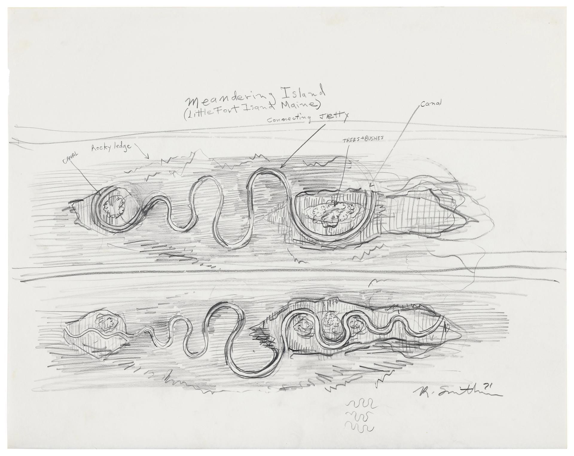 Before visiting Little Fort Island just off the coast of Harrington, Maine, which they were able to buy cheaply, Smithson made two drawings of earthworks snaking the length of the landscape. But he abandoned the concept after actually going to the site in 1972.
