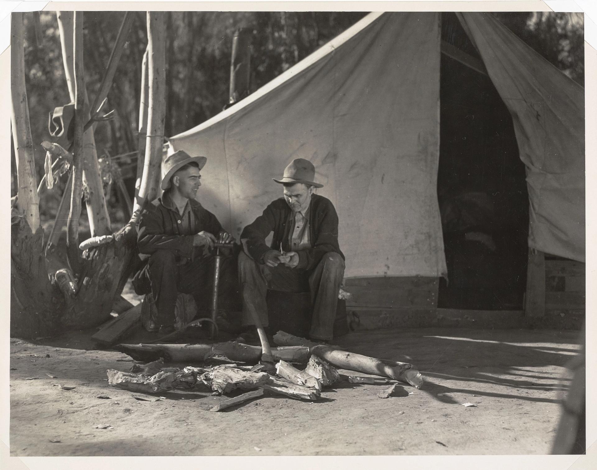 Dorothea Lange, Squatters' camp on highway. Characters in scene from Resettlement film. Near Bakersfield, California (1935) The Tsiaras Family Photography Collection