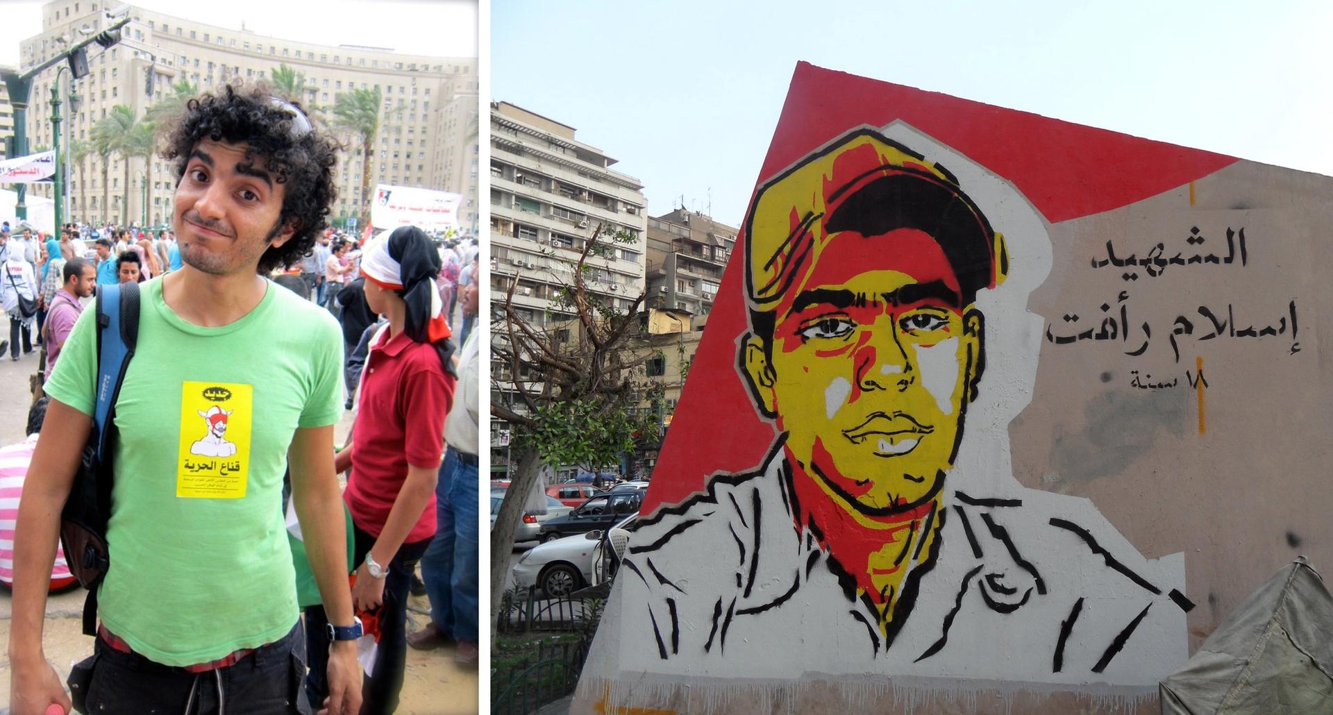 Left: artist Ganzeer and, right: his memorial portrait for 18-year-old Islam Rafat Zinhoum who killed by a security truck on 28 January 2011. It was painted in March 2011 close to Tahrir Square Ganzeer: Gigi Ibrahim; mural: Alisdare Hickson