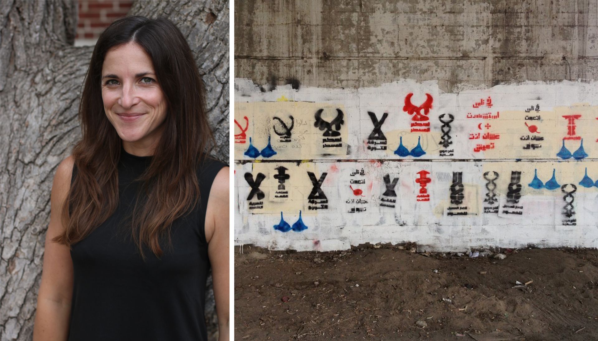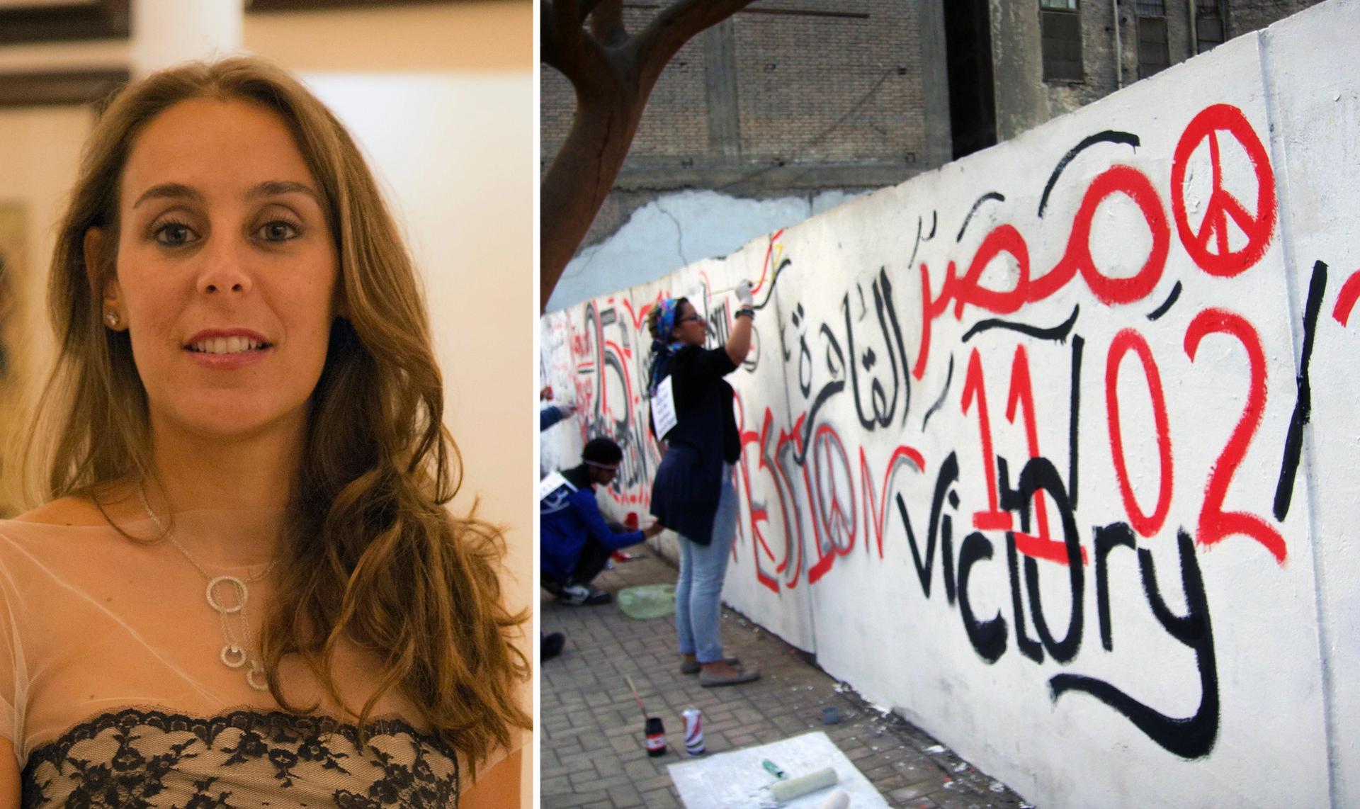 Left: Nadine Abdel Ghaffar; right: people painting on the walls in Cairo on 12 February 2011
