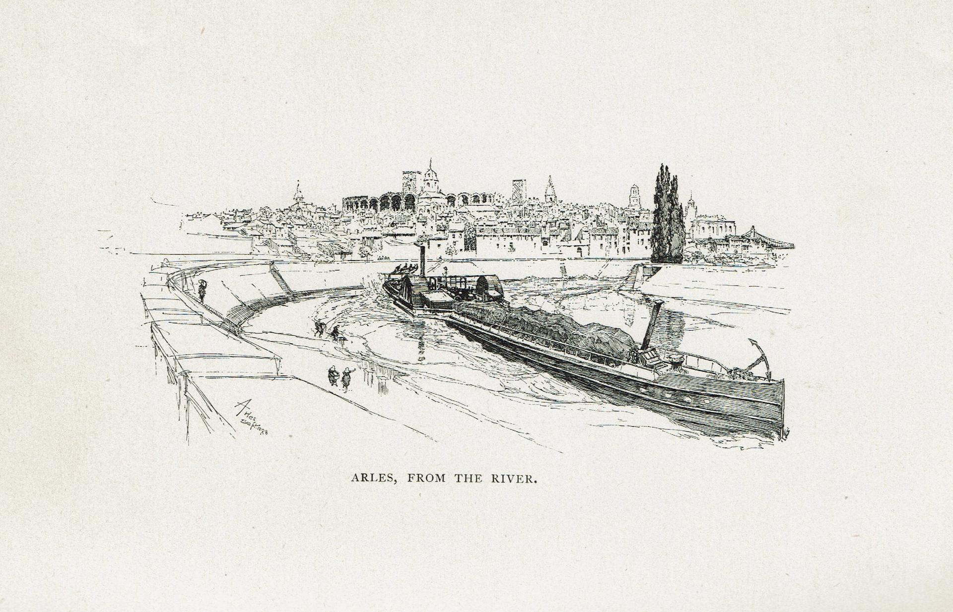 Interestingly, at this very time this spot also caught the attention of Joseph Pennell, an American-born artist who worked mainly in Britain. He was passing through Arles on a working visit in Provence. Instead of looking across the Rhône, he stood slightly higher up on the embankment and faced downstream towards the historic centre of Arles—a much more conventional composition. Pennell’s drawing Arles, from the River is inscribed “September 1888”.