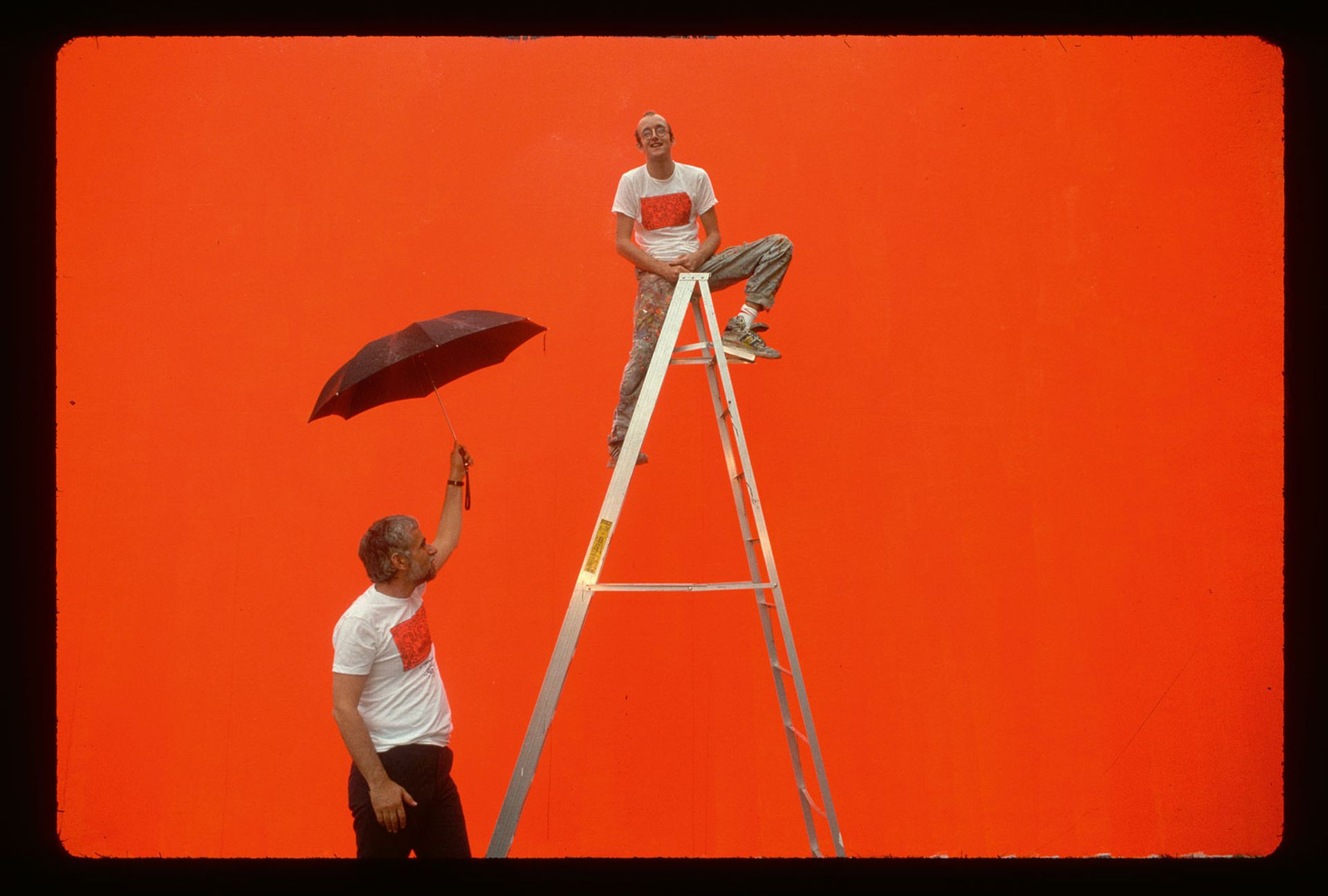 Keith Haring on a ladder, in front of the bright orange undercoat on which he would paint his mural Crack is Wack, with the New York Park Commissioner Henry Stern holding an umbrella © Getty