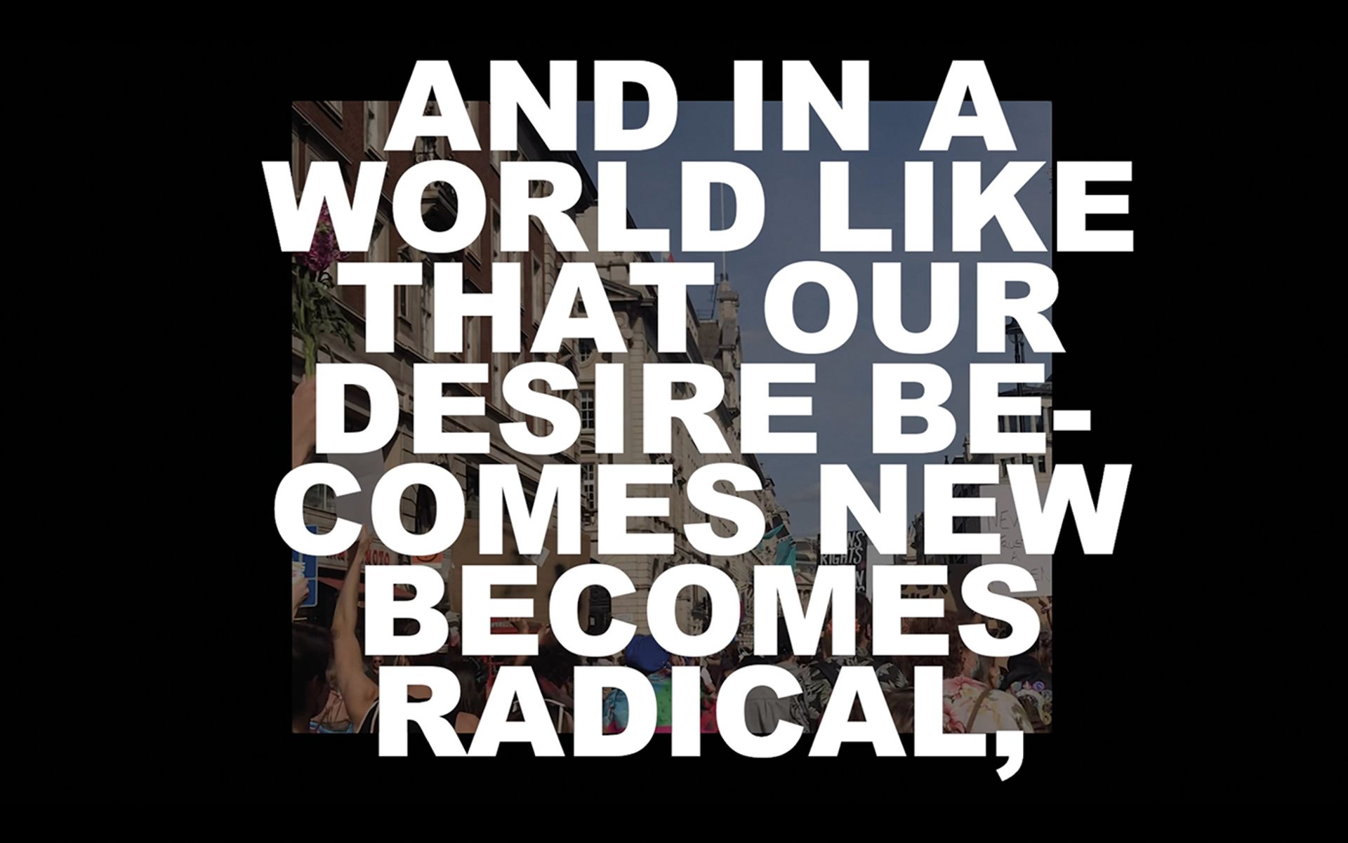 In their response to a lecture on queer desire and the post-modernist philosopher Jean-François Lyotard, the musician IceBoy Violet remixes both Rihanna’s Diamonds (2013) and a track by the dubstep pioneer Burial, of whom Fisher wrote extensively. Accompanying are bellowing revolutionary phrases and shifting graphics of dancers and lattices collapsing in on each other.