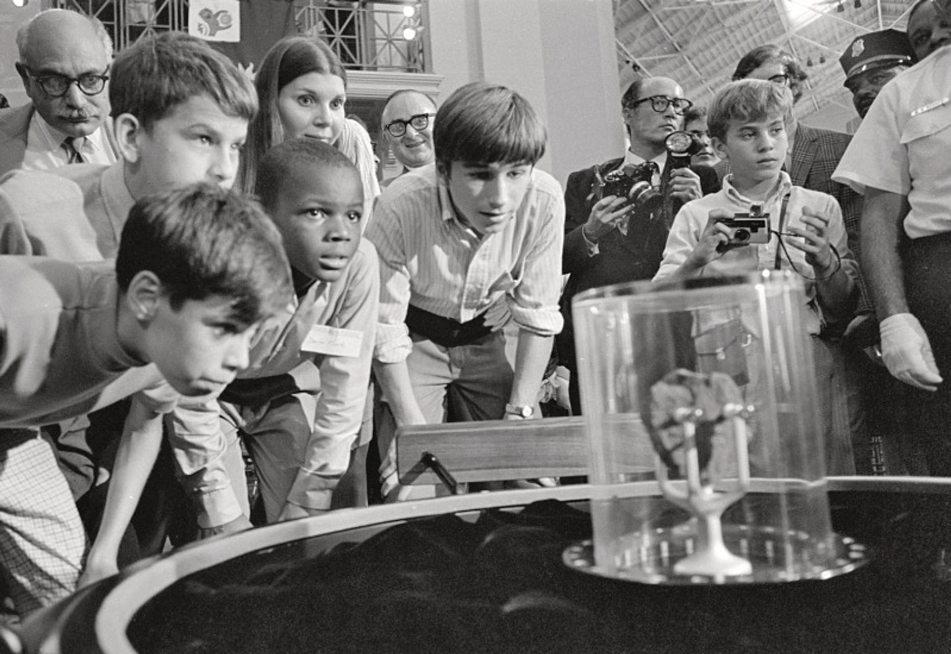 Children gathering around a moon rock displayed in the Smithsonian Arts and Industries Building’s rotunda just six weeks after an Apollo space mission returned to Earth in 1969 Courtesy of the Smithsonian Archives