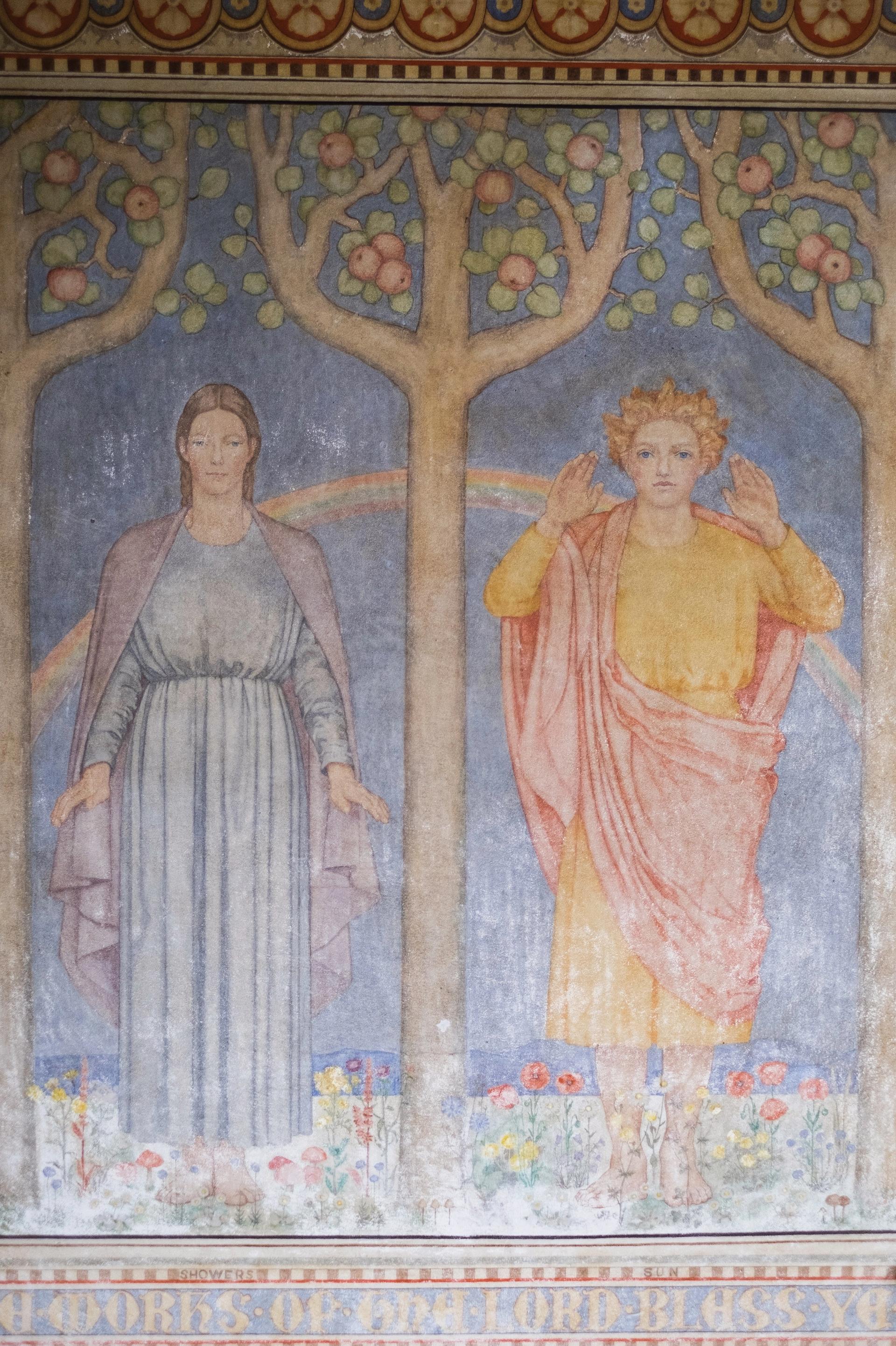 The original interior must have been very bare. The flint-walled church was built by villagers using donated materials, without foundations or even a properly attached roof—though both have now been sorted. In the barn-like building, the paintings seem strikingly unusual, even in their damaged state. Apart from the central Annunciation and angels decorating the chancel arch, they are not overtly religious, instead symbolising seasons and weather, with a dado featuring recognisable local landscapes inspired by a Victorian hymn.