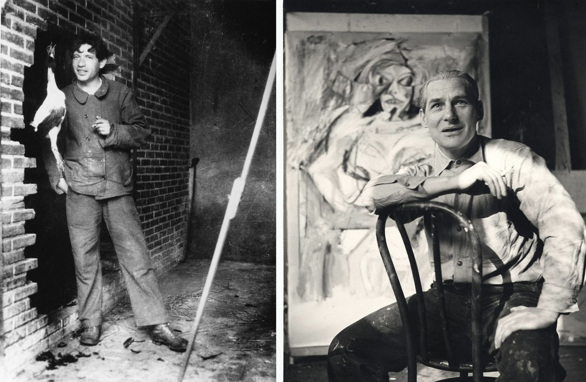 Chaïm Soutine with a chicken hanging in front of a broken wall in Le Blanc in 1927, and Willem de Kooning in front of Woman I in the early 1950s Photo: courtesy of Klüver/Martin Archive; Photo: Kay Bell Reynal. Archives of American Art, Smithsonian Institution, artwork © 2021 The Willem de Kooning Foundation/ARS