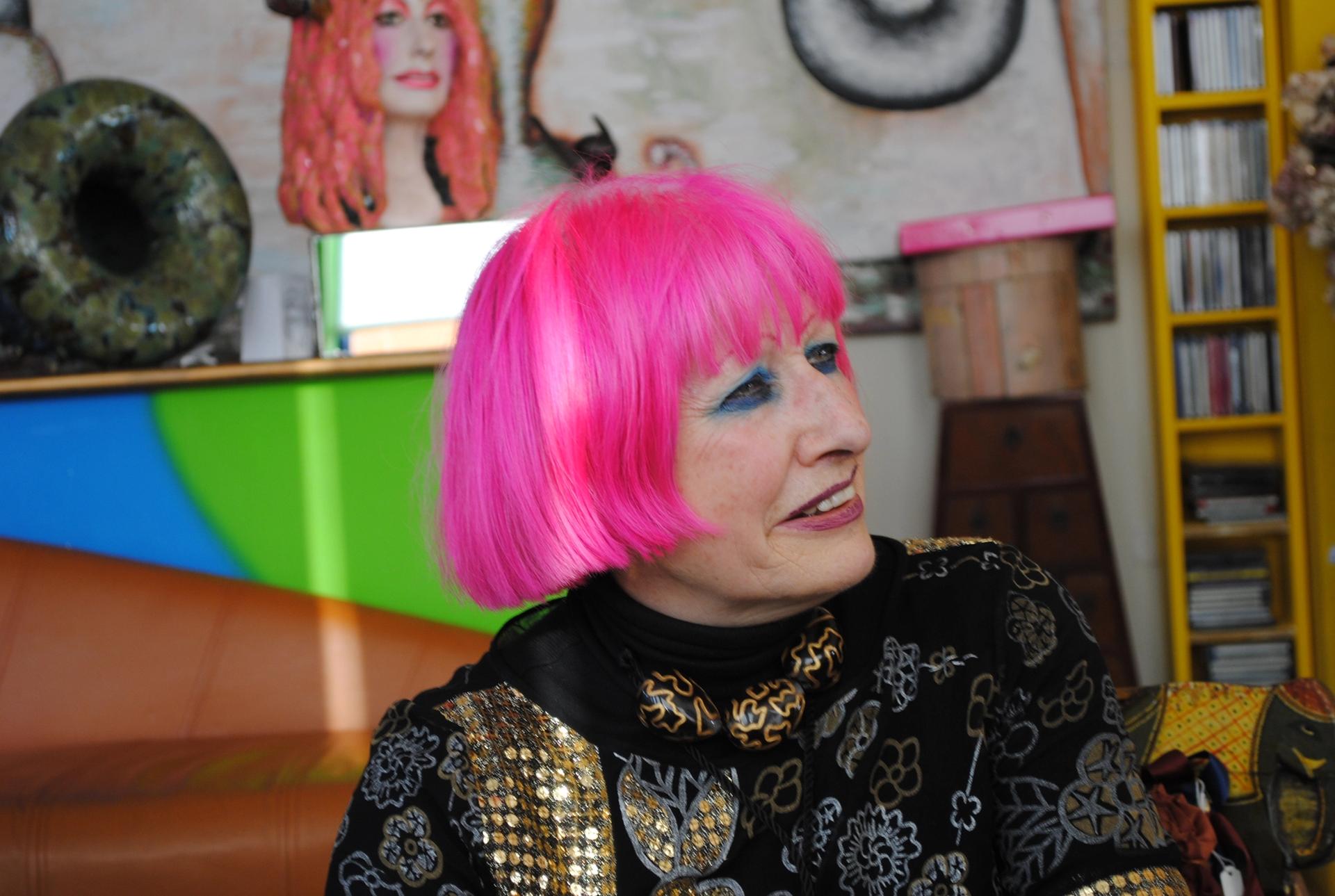 Duggie Fields with Zandra Rhodes, Andrew Logan & Luciana, at the Alternative Miss World film premiere, Vogue April 1990 © Duggie Fields