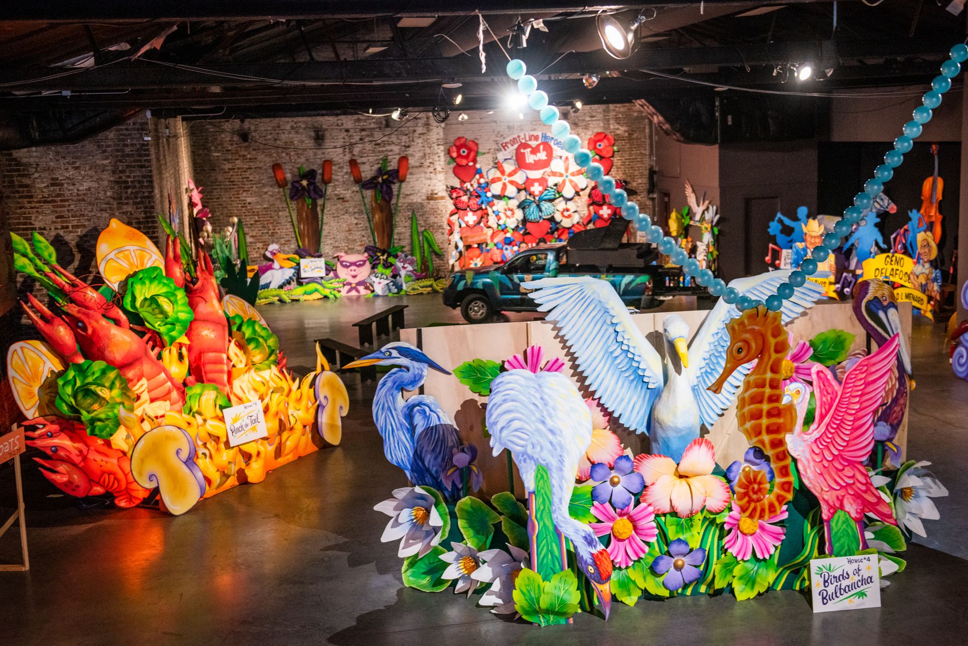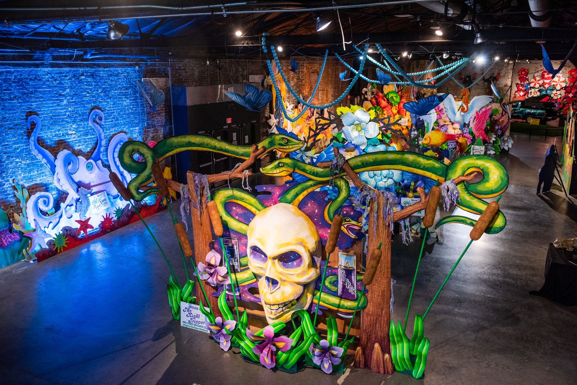 The show presents the decorations from 18 “house floats”, with parade builders hired for the installation and participating artists serving as paid docents, while piano players will perform periodically during the show. Each house float is presented individually, with actual elements of the decorations leaning on walls, displayed as sculptures that visitors can circle, or hanging from the exposed rafters of the 12,000 sq. ft warehouse space (which the CAC had also lent as a workshop for the initiative). These include the butterflies and strands of Mardi Gras pearls from the jeweller Mignon Faget’s float, Butterflies of Winter. Photographs taken by Ryan Hodgson-Rigsbee of the float-making process are also displayed.