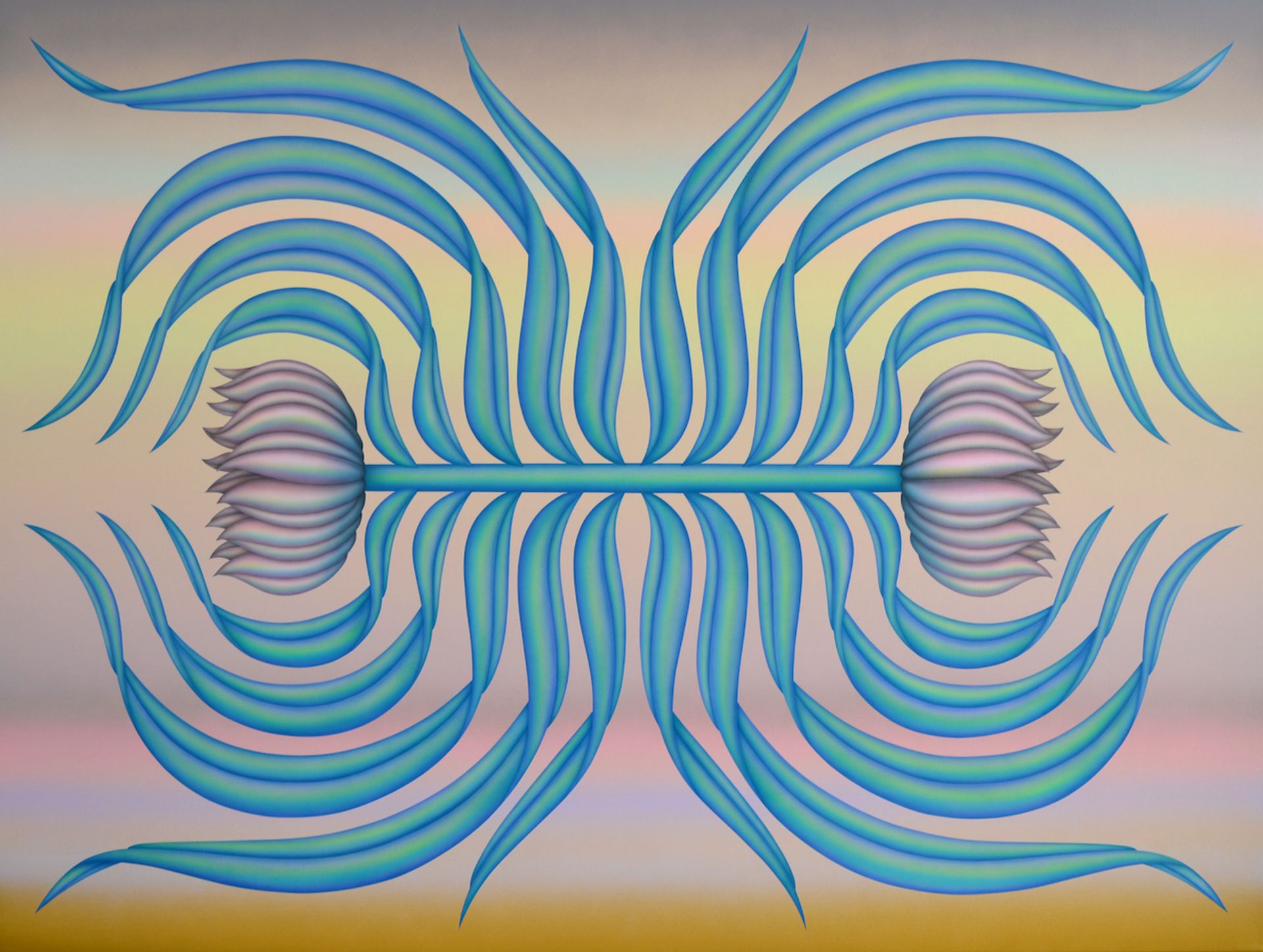 The Los Angeles-based artist’s first solo show in New York brings together eight rich, quasi-surrealist canvases—all carried out in 2021—that each show flora and fauna in improbable contortions, many dancing with a perfect symmetry. The result is a suite of psychedelic paintings, both organic and exacting in their construction, that invoke smartly modern William Morris compositions. Her articulation of depth and form strikes a balance with contemporaries like Loie Hollowell and Julie Curtiss; and like Curtiss, Greene also has a propensity towards painting extraordinary hair, though the hair works are not on view here. The title Splitting may refer to a number of hotspots, among them humanity’s split from nature (which is perhaps doubled in our splitting of the atom), the faultless split compositions of the paintings themselves, and the bifurcated ways in which the works arouse both a sense of whimsy and a sense of order. These contradictory tendencies—order and disorder—are baked heavily into these paintings, and as in the rhythms of life, each often arrives disguised as its opposite.