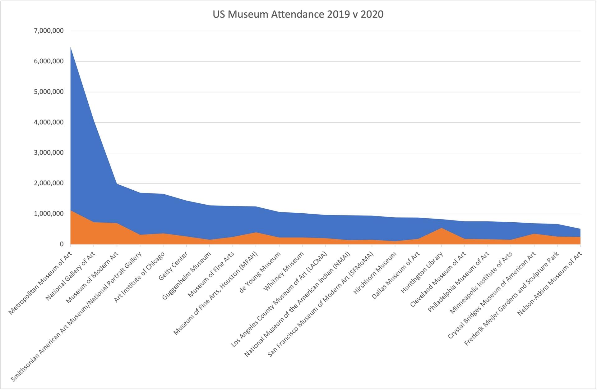 The great equaliser: the coronavirus pandemic flattened attendance at museums across the US. This chart compares visitor numbers to the top institutions in 2019 (in blue) and in 2020 (in orange) Image: The Art Newspaper