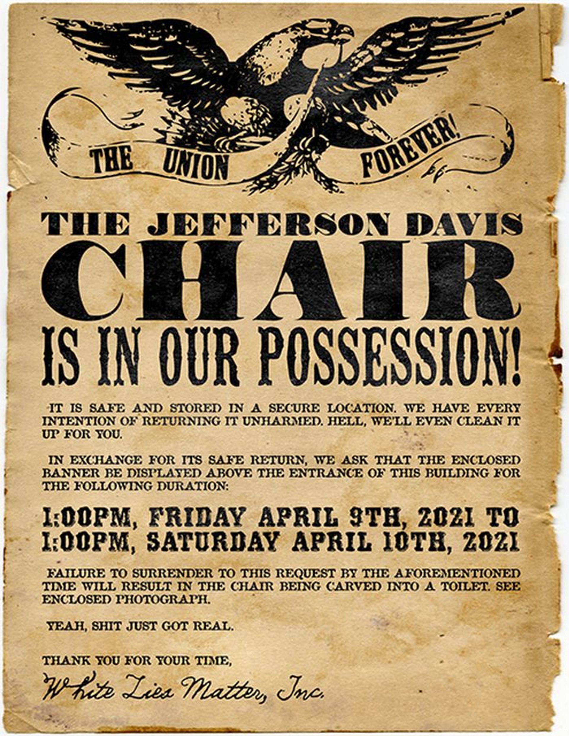 In their letter, the group included an image that appears to show their members removing the chair from the cemetery, and another picture of it in their possession. The ransom note was styled to look like a 19th-century flyer, and White Lies Matter has mocked up images of what the chair would look like converted into a toilet as well as what the UDC headquarters would look like with the large Shakur banner displayed.