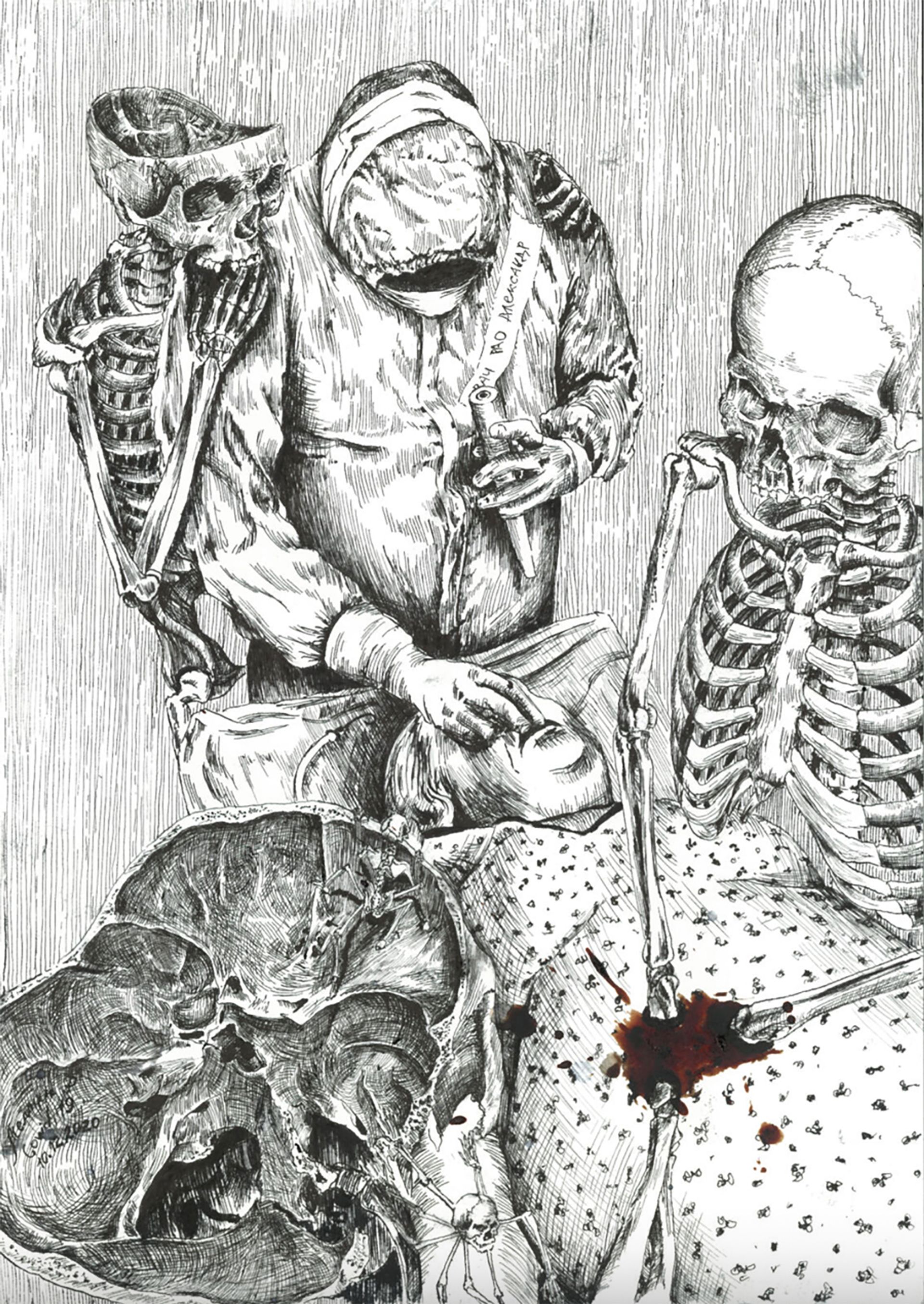 Ruslan Mellin is a facial surgeon based in Siberia who has been treating victims of brutal domestic violence for years—and, more recently, of Covid-19. Art is his salvation and a window onto the humanity of his patients. His drawings have attracted attention in Russia and are now becoming noticed internationally thanks to Meduza, a Russian news site that has profiled him and his work.