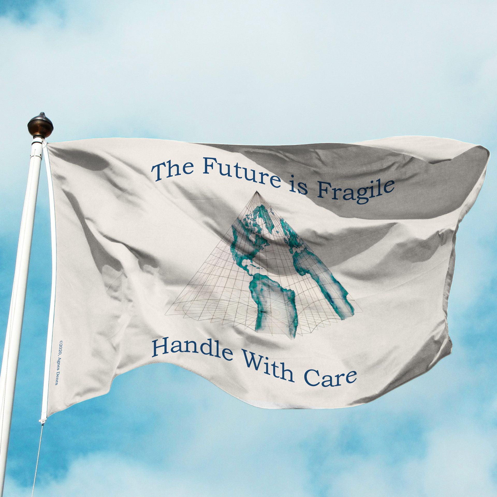 The Future is Fragile, Handle with Care, 2021 flag by Agnes Denes Agnes Denes, courtesy Leslie Tonkonow Artworks + Projects & Culturunners.