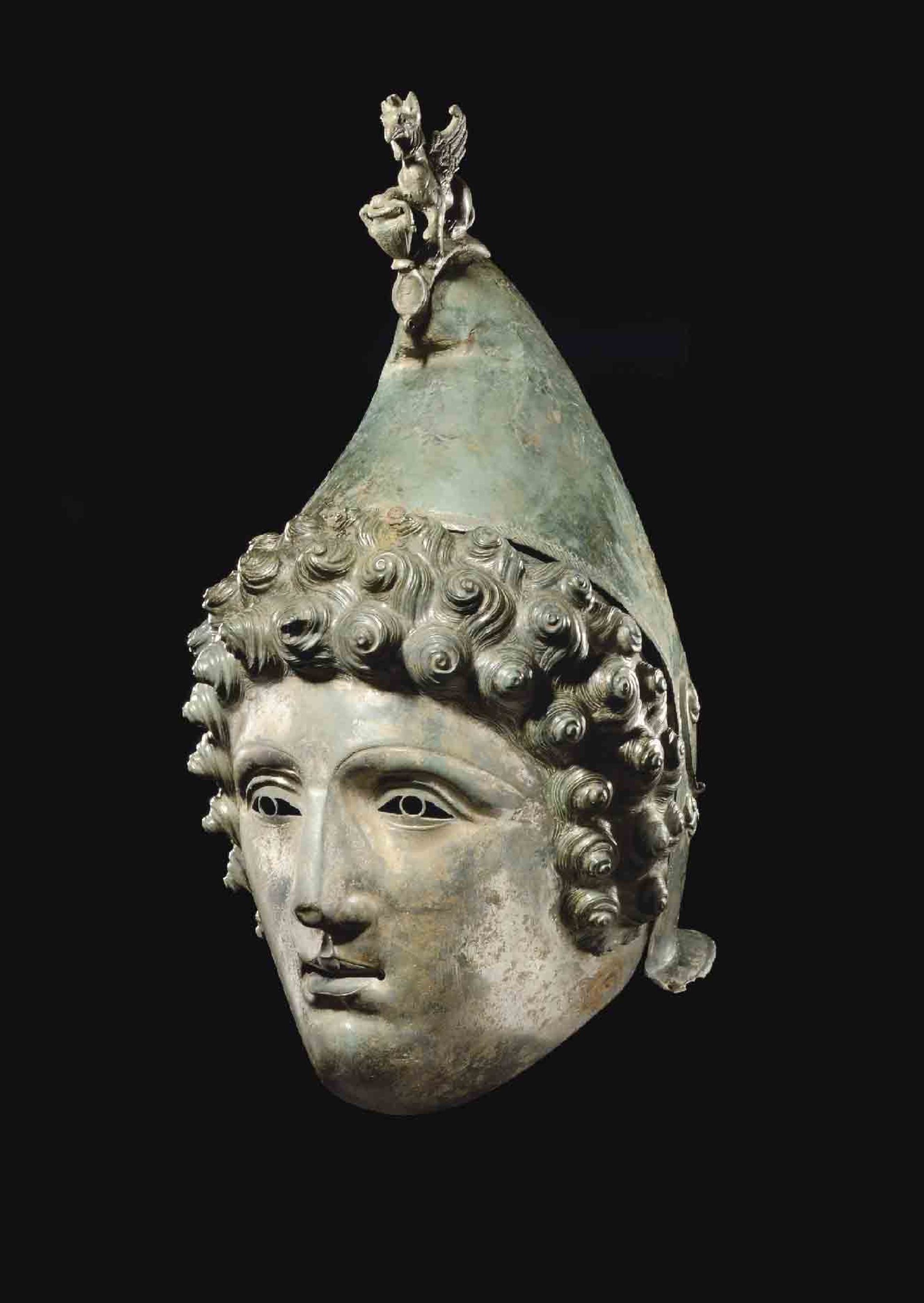 The Crosby Garrett Helmet, a copper alloy Roman cavalry helmet dating from the late 2nd or early 3rd century AD which was found by a metal detectorist in Cumbria in 2010 Courtesy of the Portable Antiquities Scheme
